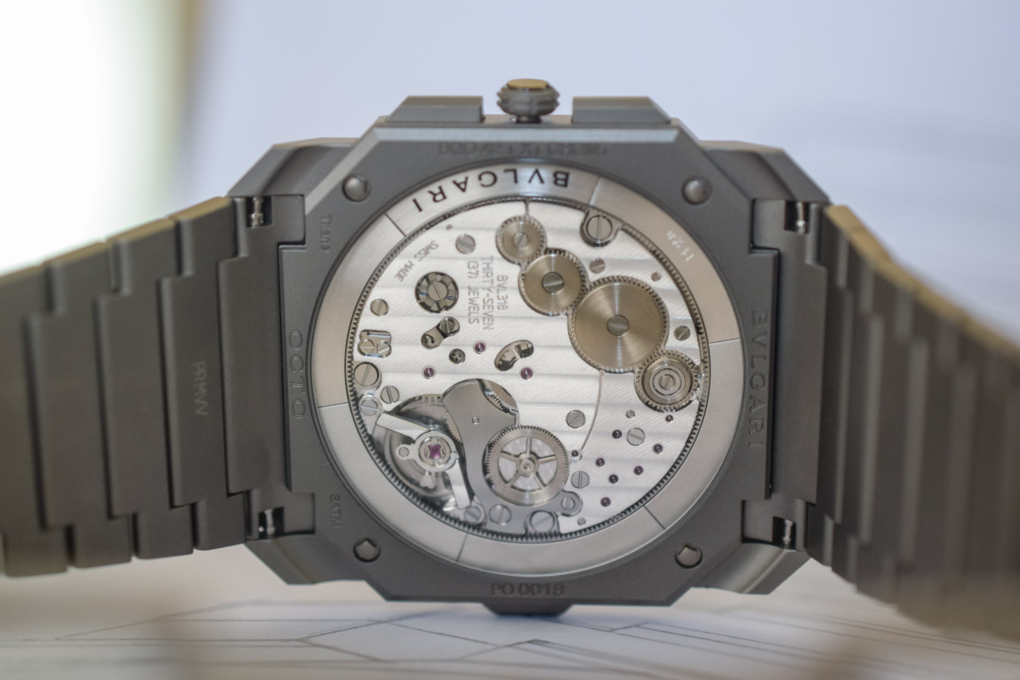 Why this one? Because you’re looking at one of the most innovative chronographs of the last decade, and the thinnest chronograph movement and watch ever created. Already possessing the record for the thinnest minute repeater, the thinnest hand-wound tourbillon, the thinnest automatic HMS watch and the thinnest automatic watch (all complications included), Bvlgari now sets its fifth world record with the Bvlgari Octo Finissimo Chronograph, with an impressive movement.