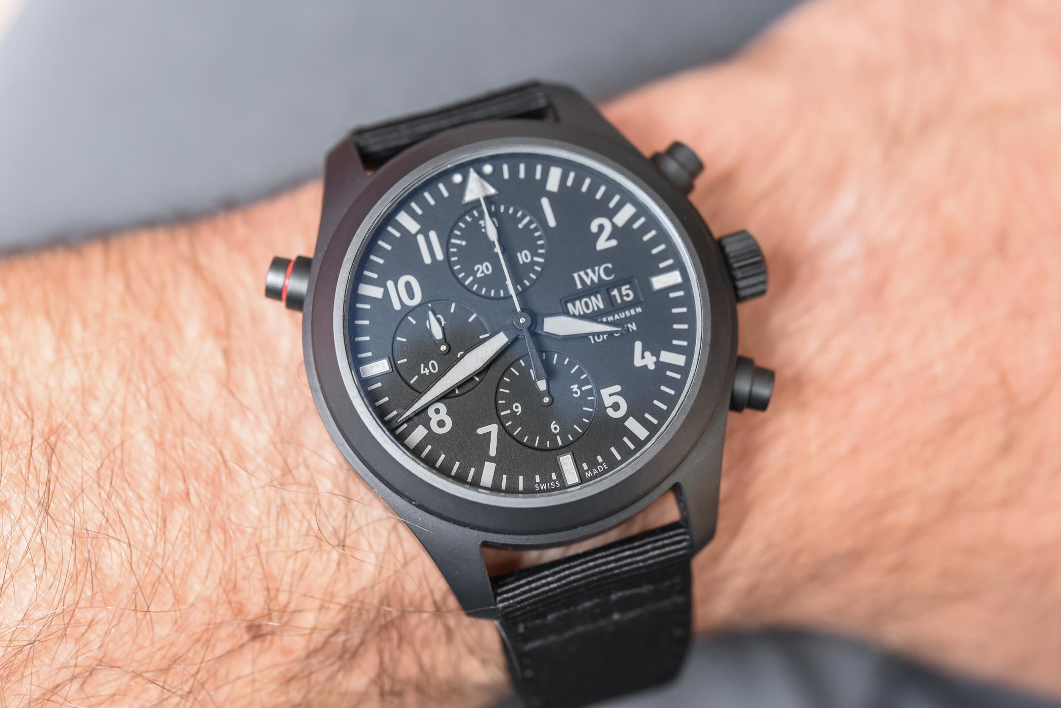 Quick facts: 44mm diameter x 16.7mm height – matte-black Ceratanium case, pushers and crown – Calibre IWC 79420, based on Valjoux architecture – automatic split-seconds chronograph – reference IW371815 – EUR 14,700