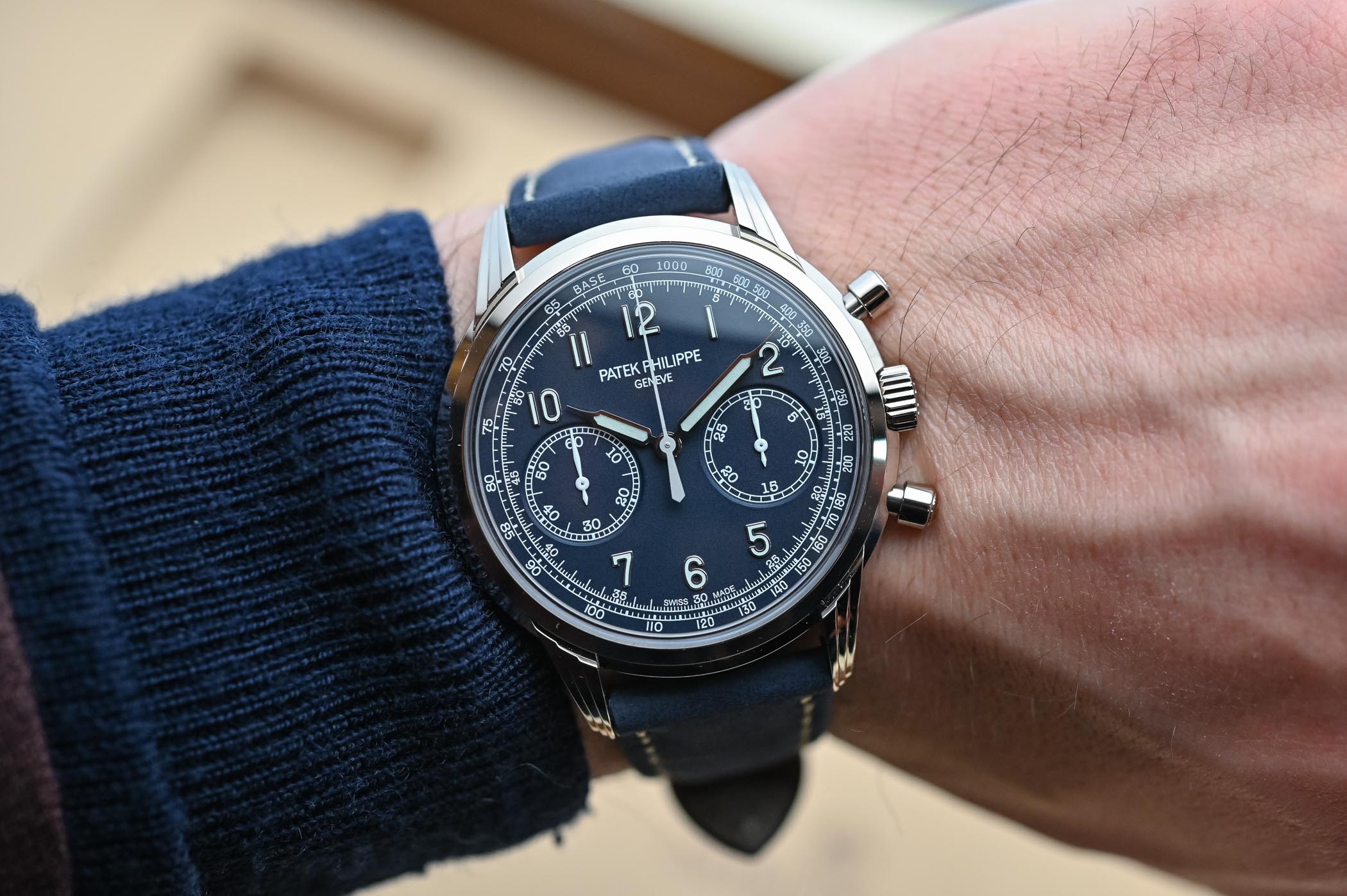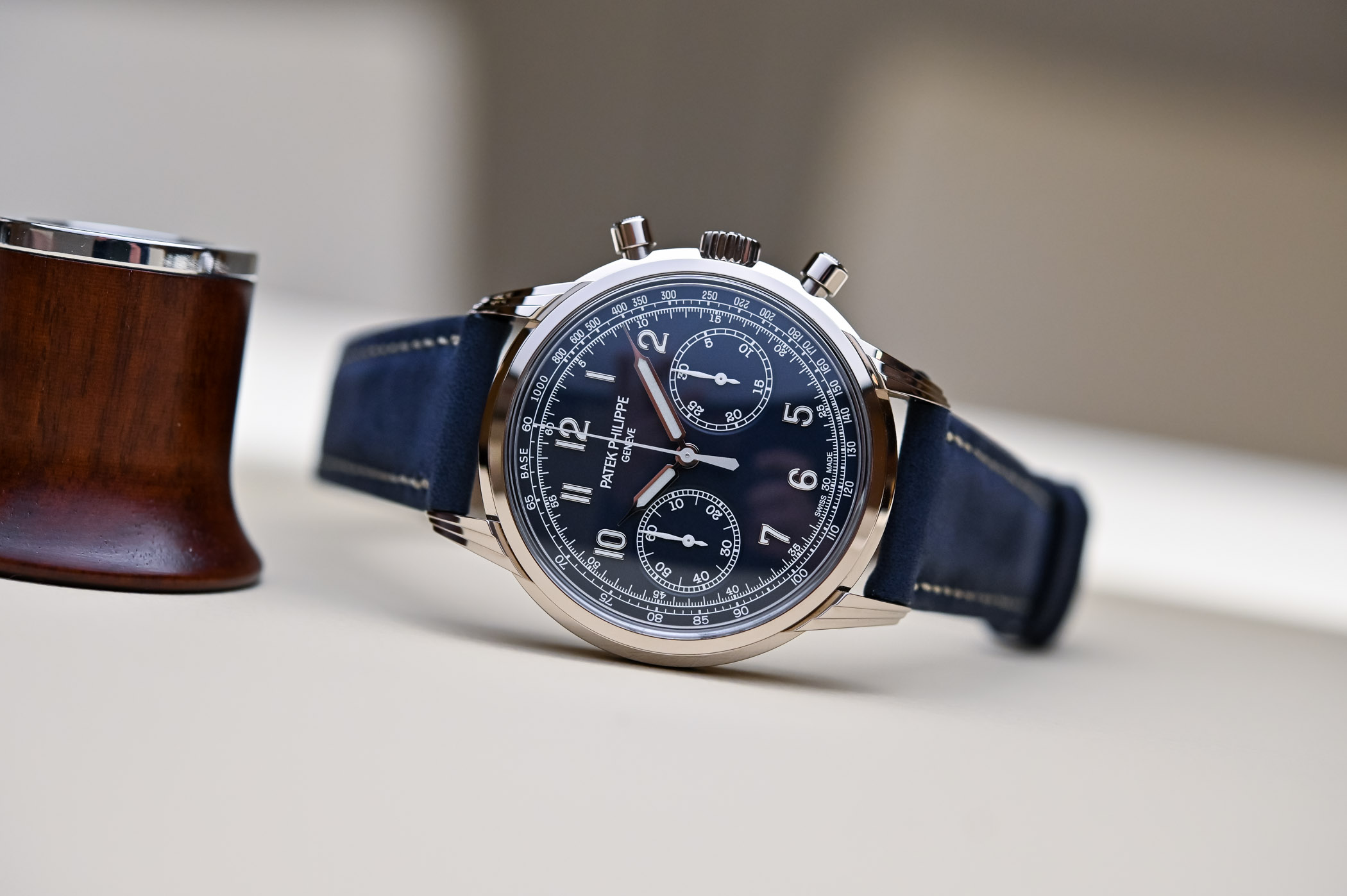Quick facts: 41 mm white gold case – water-resistant to 30m – hand-wound calibre with hours, minutes, small seconds, chronograph with instantaneous minutes – alligator strap with folding clasp – CHF 65,000 – www.patek.com