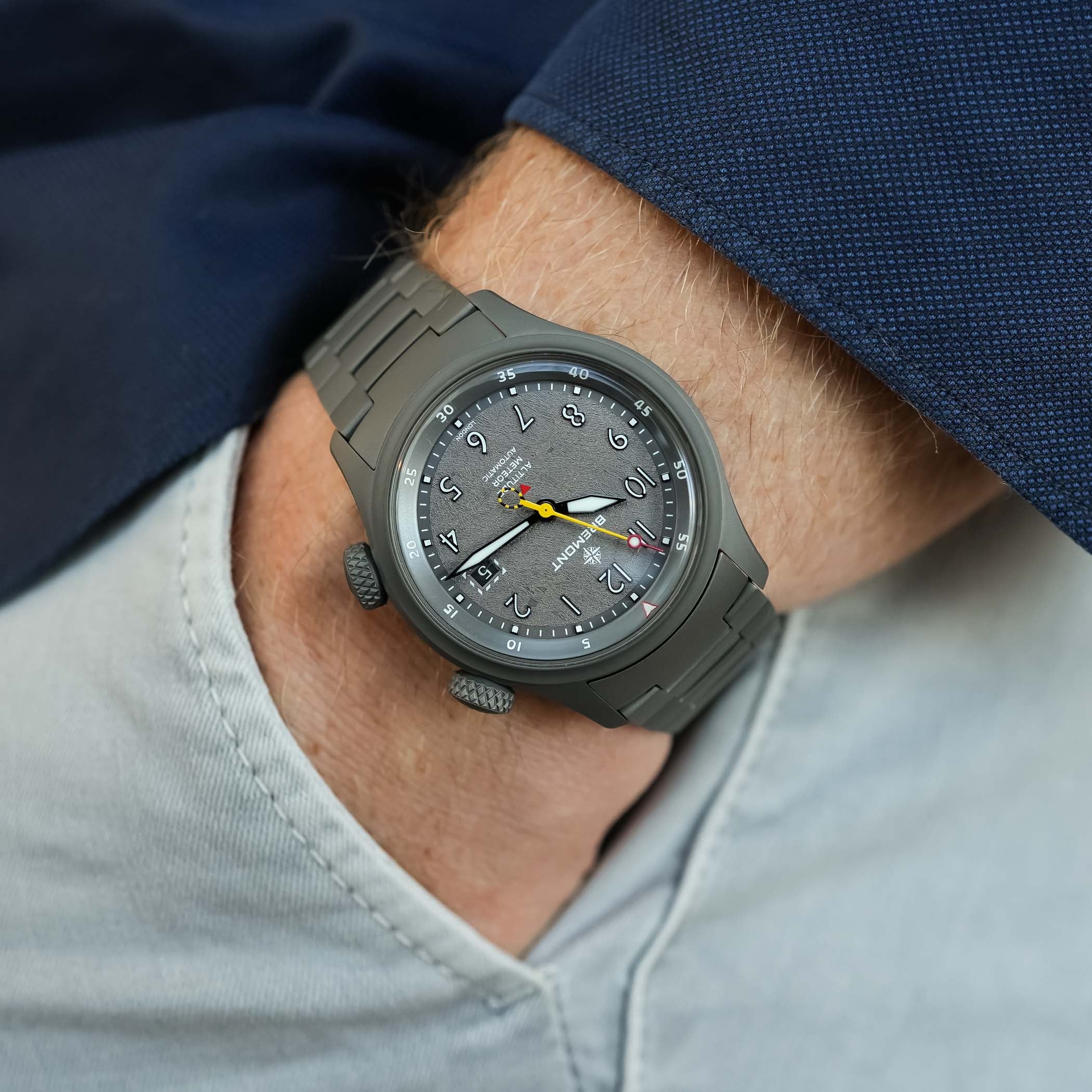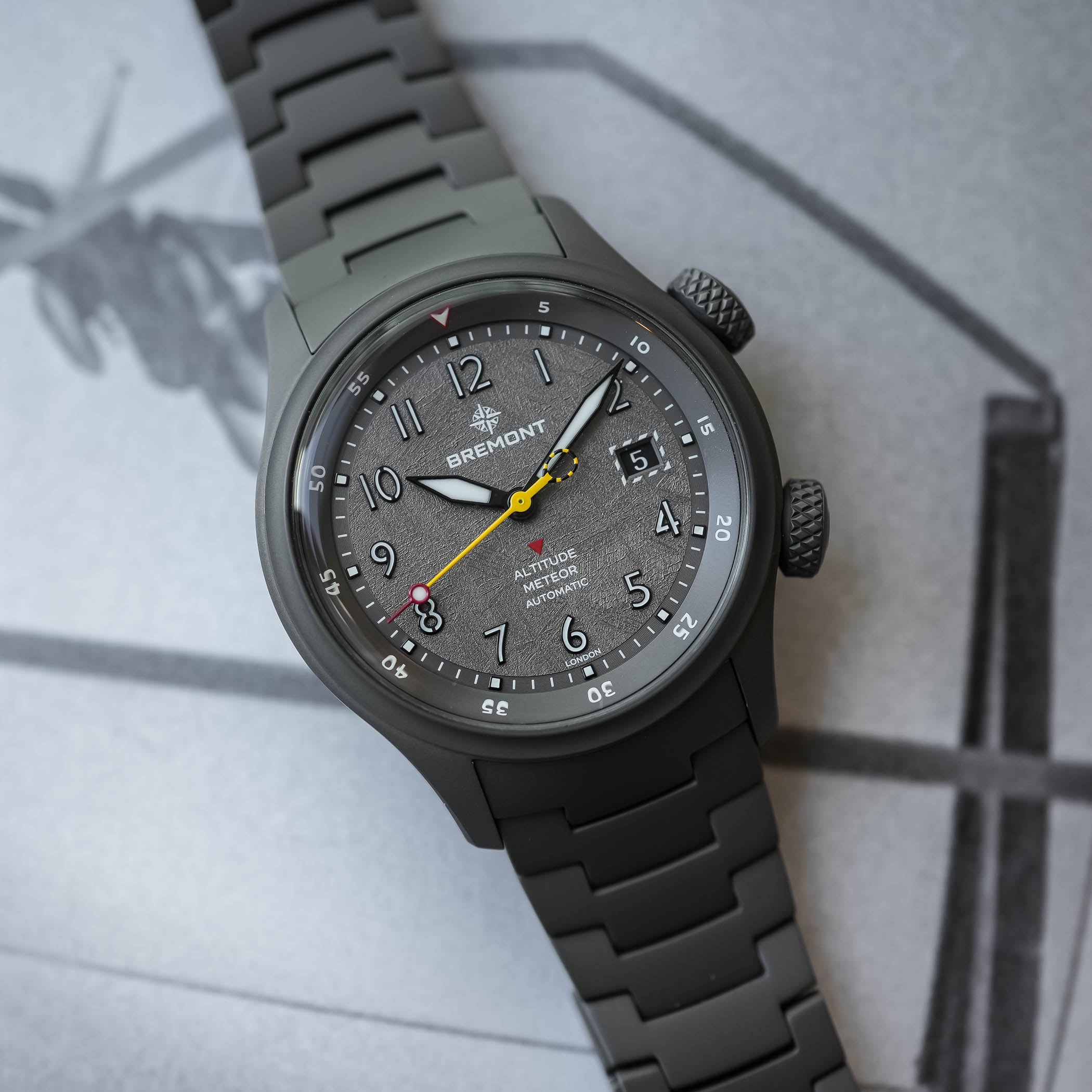 Founded by brothers Nick and Giles English in 2007, Bremont’s identity was forged upon aviation and military-inspired watches with a strong British accent. Now piloted by CEO Davide Cerrato, fans were delighted with the release of the Altitude MB Meteor that continues the saga of the iconic MB1 originally released in 2009, complete with the patented hyper-robust Trip-Tick case with two crowns designed to withstand the extremes of Martin-Baker’s ejection seat trials. The monochromatic Stealth Grey reference, with its 42mm titanium case and ultra-matte, light-absorbing finish, captures the look and feel of stealth aircraft. Pursuing the stealth theme, the grey dial features an embossed meteorite, while the yellow central seconds hand pays homage to the original MB1 with its black-and-yellow looped counterweight inspired by the ejector seat’s pull handle. Powered by an automatic calibre based on the La Joux-Perret G100 with a 68-hour power reserve, we can’t think of a better companion for your first ejection seat experience.
