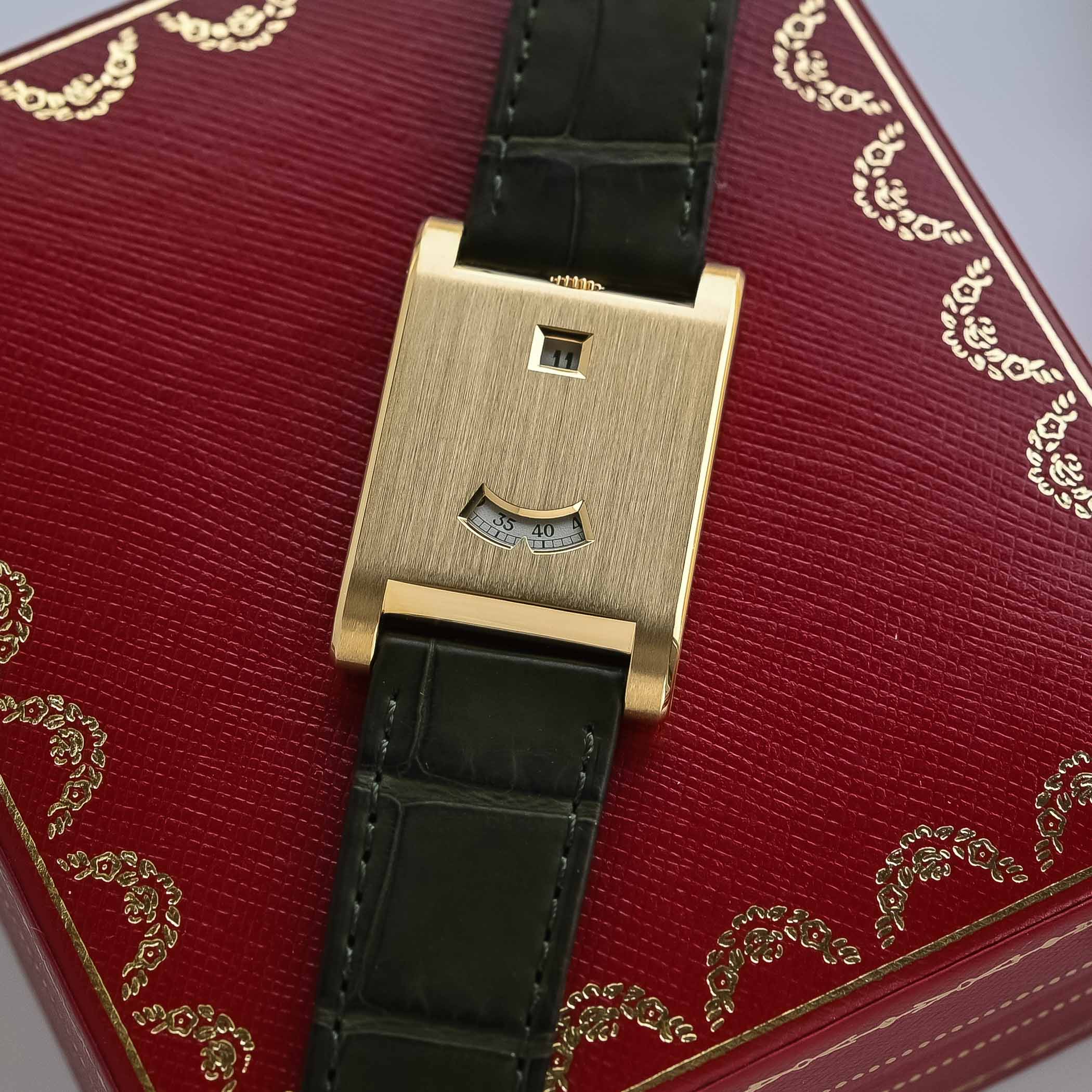 Among Cartier’s many shaped icons, this digital-display Tank from 1928 stands apart for its minimalism and mystery: a solid metal façade punctuated only by two apertures for the jumping hours and dragging minutes. For 2025, the Cartier Privé collection revives it in four versions: yellow gold with green accents, rose gold with grey, and platinum with burgundy, plus a limited 200-piece platinum model that twists the apertures diagonally across the case. All remain compact, measuring 24.8mm x 37.6mm x 6mm, powered by the new hand-wound Calibre 9755 MC, featuring improved jump stability. The case keeps the original 1928 design, with the crown at 12 o’clock, a vertically brushed top plate, and brancards that blend into the case. It is sleek, mysterious, and clearly Cartier.