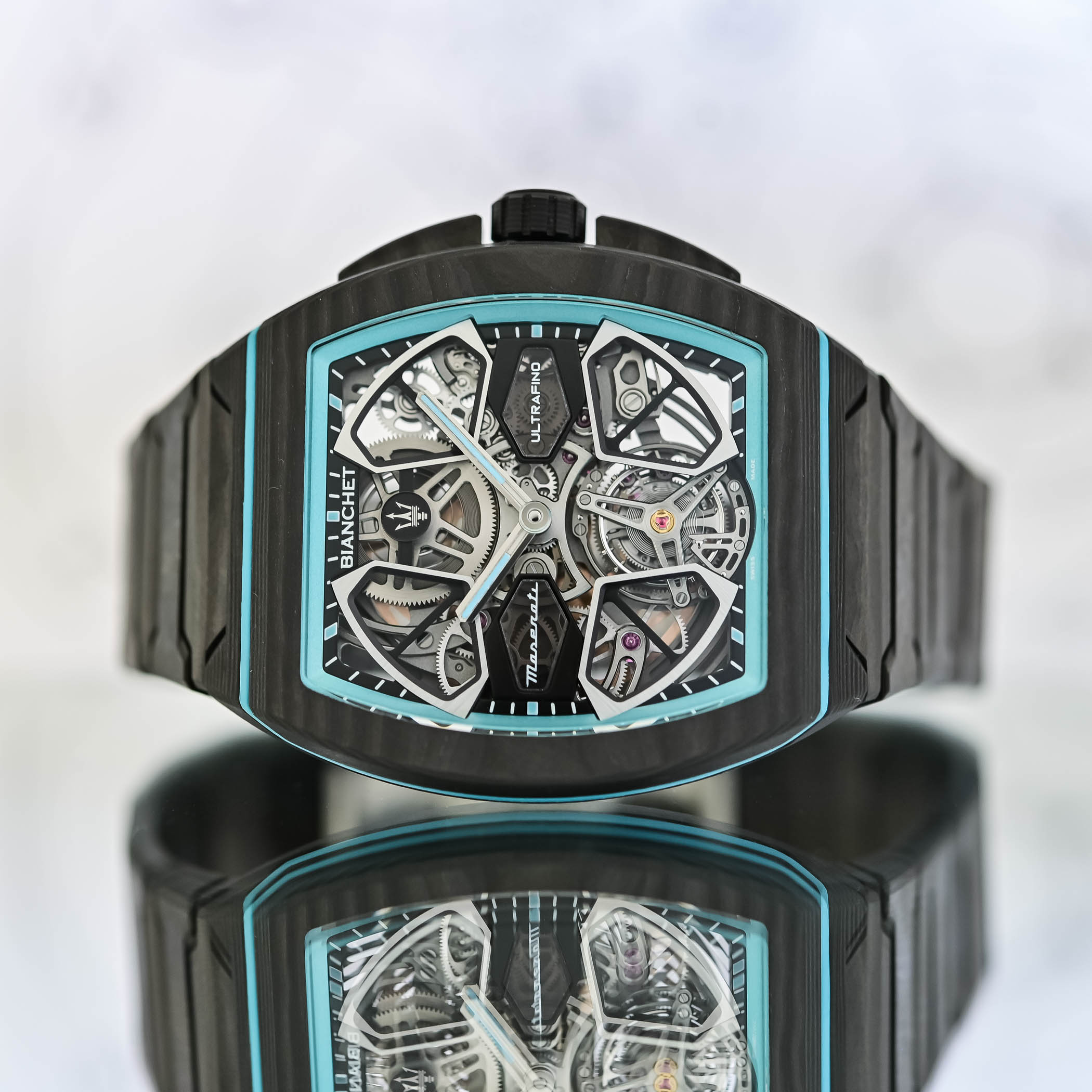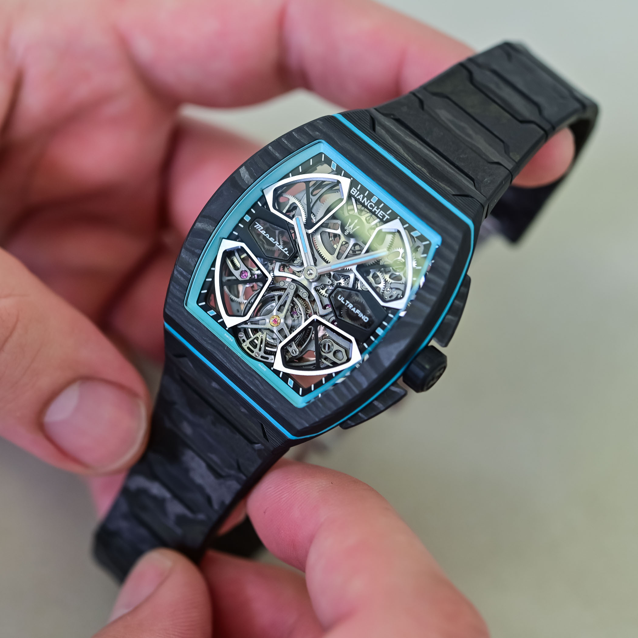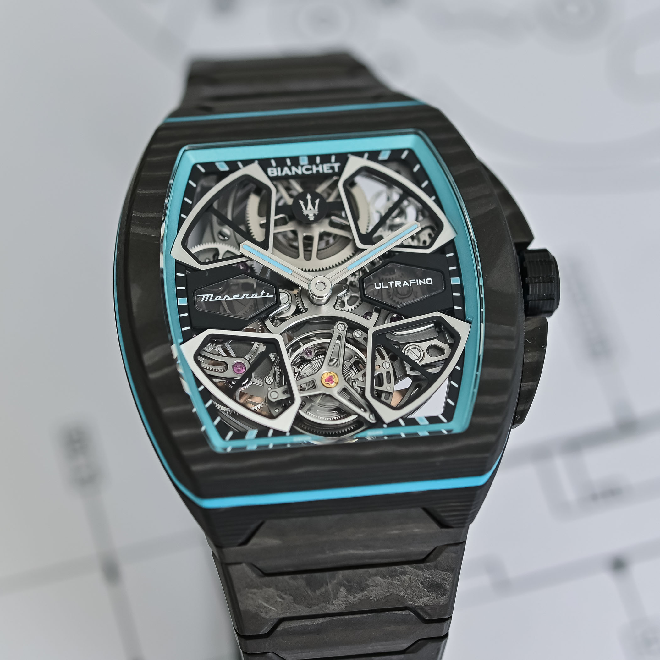 The Bianchet UltraFino Maserati is obviously closely linked to Maserati’s MCPURA, a supercar powered by a twin-turbo Nettuno V6. This engine is based on Formula 1 technology, while the car itself is designed to stay light and well-balanced, using a carbon-fibre structure. Performance figures are strong, with 0 to 100 km/h in under 2.9 seconds, but more importantly, the focus is on weight, balance, and material use. Bianchet goes the same way with its UT01 flying tourbillon movement, keeping the watch thin, light, and stable. This is not a new territory for the brand, as seen in its earlier Ultrafino Carbon models, prioritising weight and comfort on the wrist.