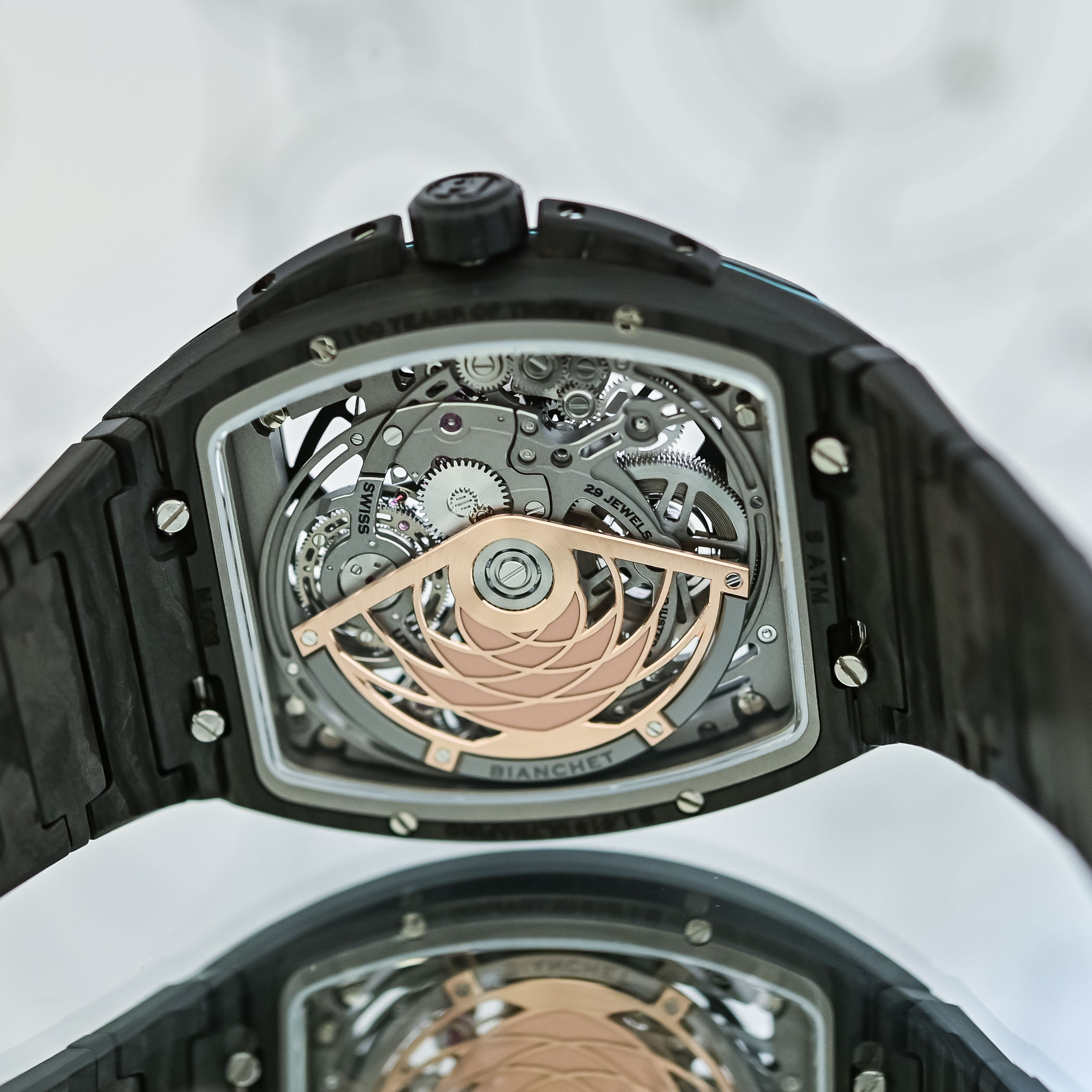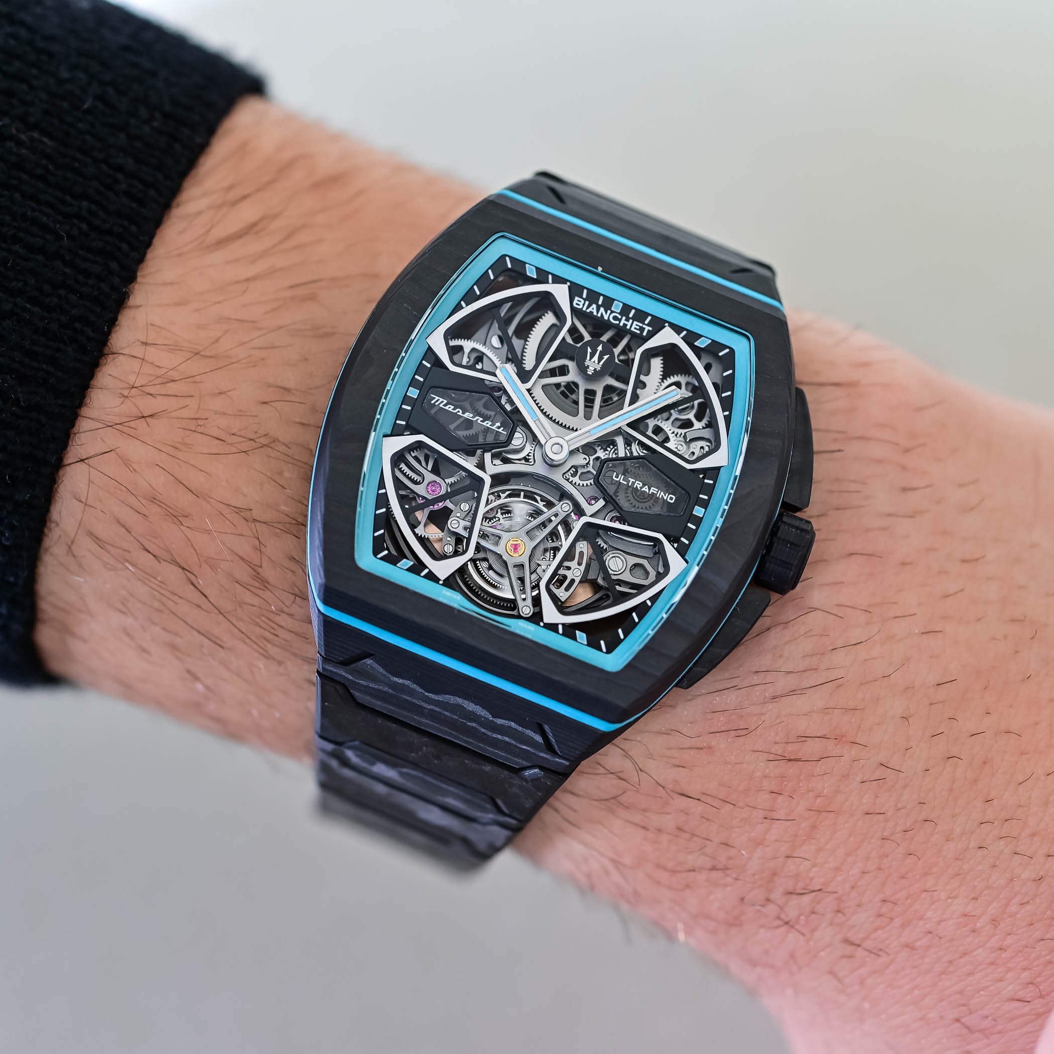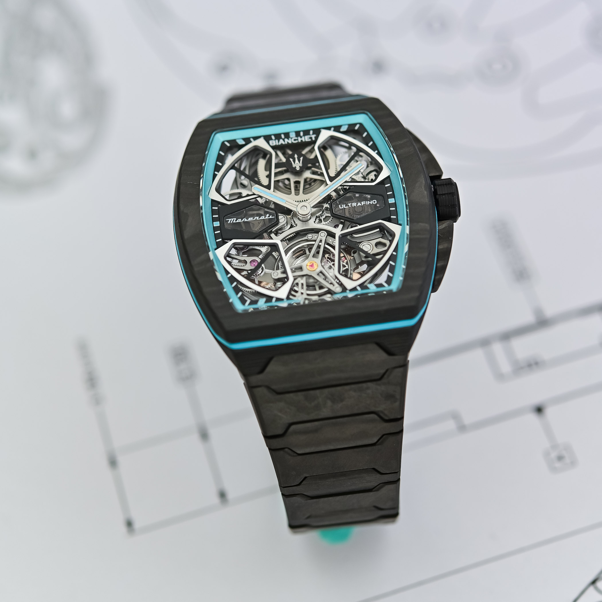 The Bianchet UltraFino Maserati is obviously closely linked to Maserati’s MCPURA, a supercar powered by a twin-turbo Nettuno V6. This engine is based on Formula 1 technology, while the car itself is designed to stay light and well-balanced, using a carbon-fibre structure. Performance figures are strong, with 0 to 100 km/h in under 2.9 seconds, but more importantly, the focus is on weight, balance, and material use. Bianchet goes the same way with its UT01 flying tourbillon movement, keeping the watch thin, light, and stable. This is not a new territory for the brand, as seen in its earlier Ultrafino Carbon models, prioritising weight and comfort on the wrist.