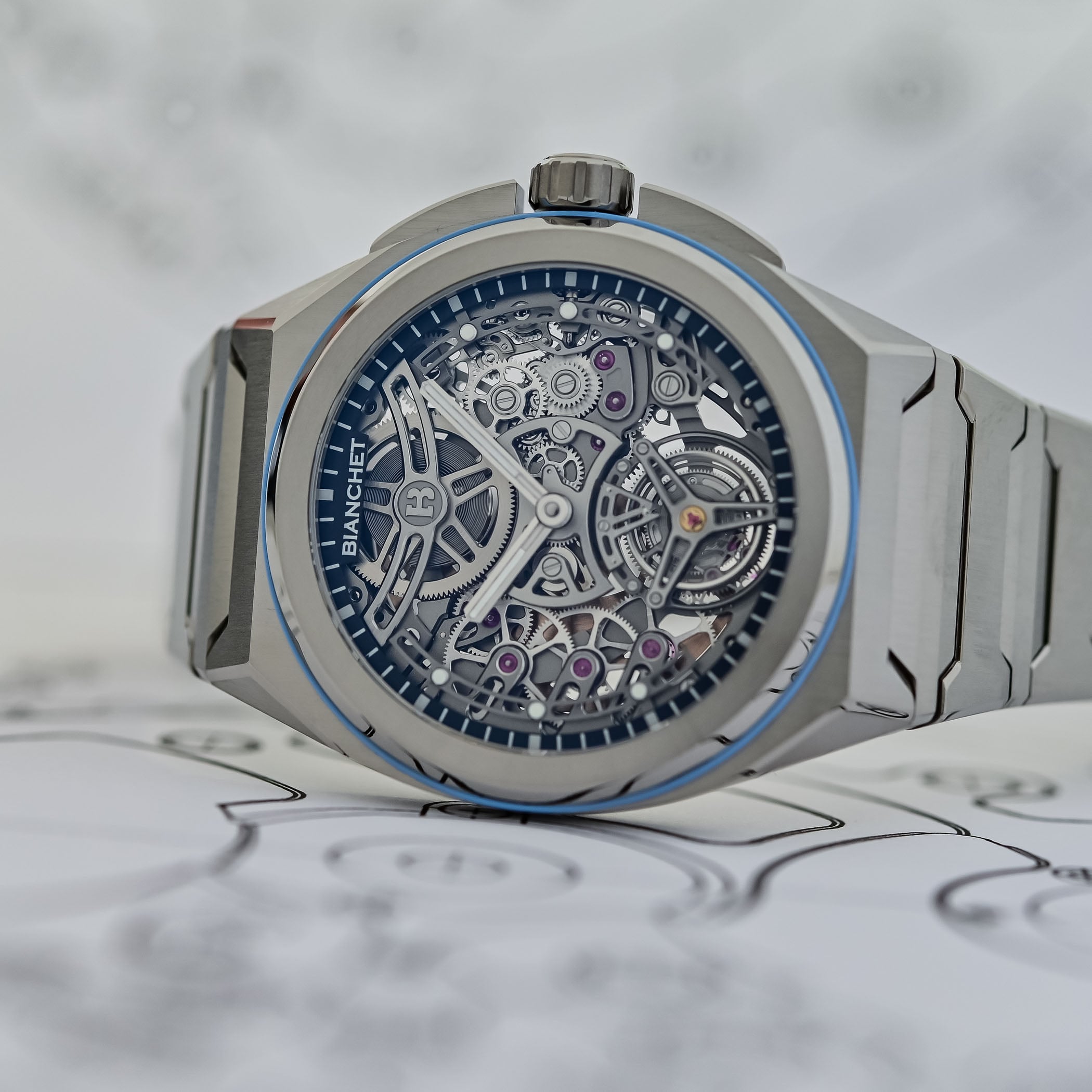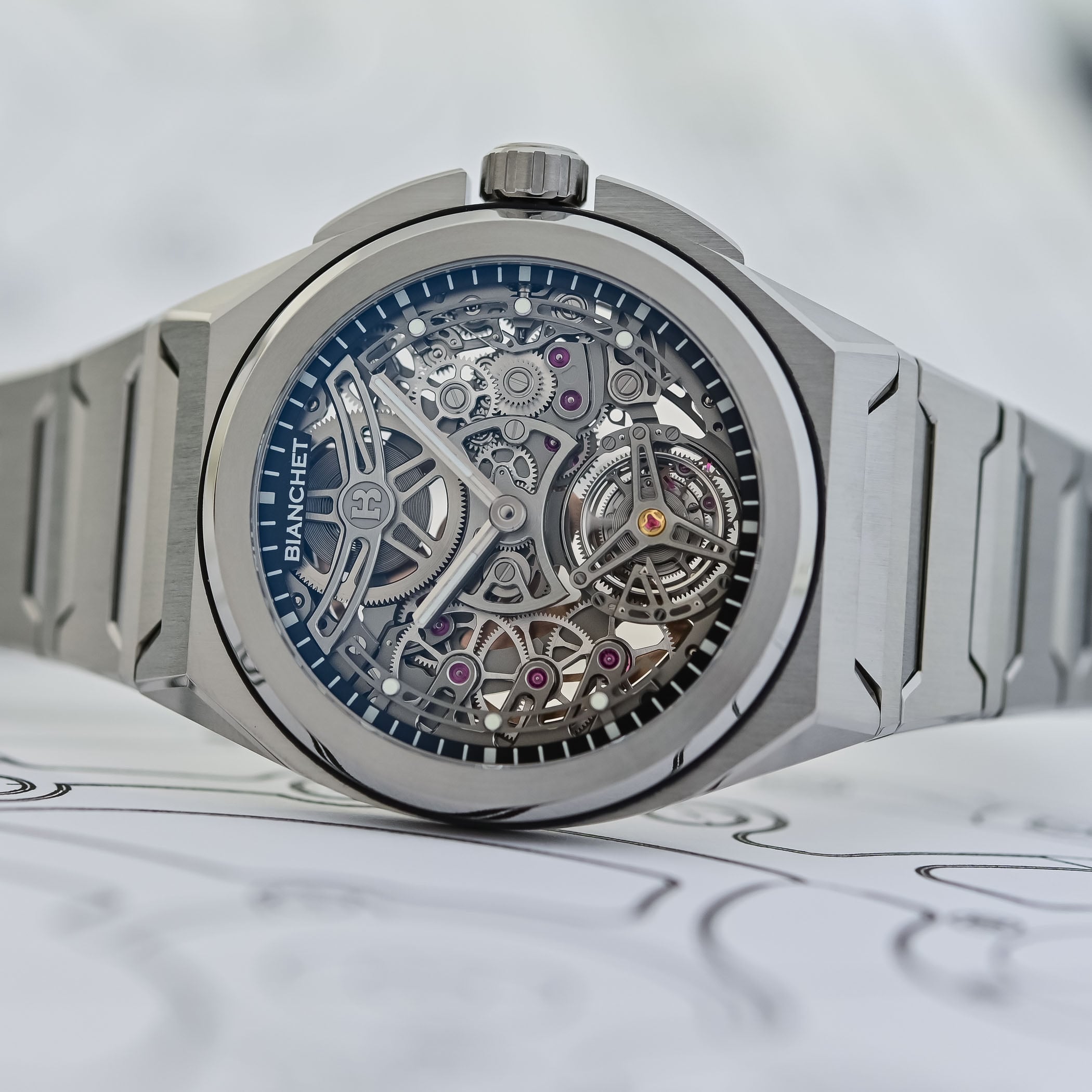 The integrated design of the new model seamlessly blends case and bracelet, creating a cohesive and ergonomic whole. The visual identity retains some Bianchet DNA: a geometric foundation, where sharp lines and structured angles interact with fluid curves inspired by the golden ratio. The round bezel provides a striking contrast to the more angular, dynamic architecture of the case and bracelet, which reinforces the tension of the design. A signature element of the brand, the rubber gasket positioned beneath the bezel, remains present.