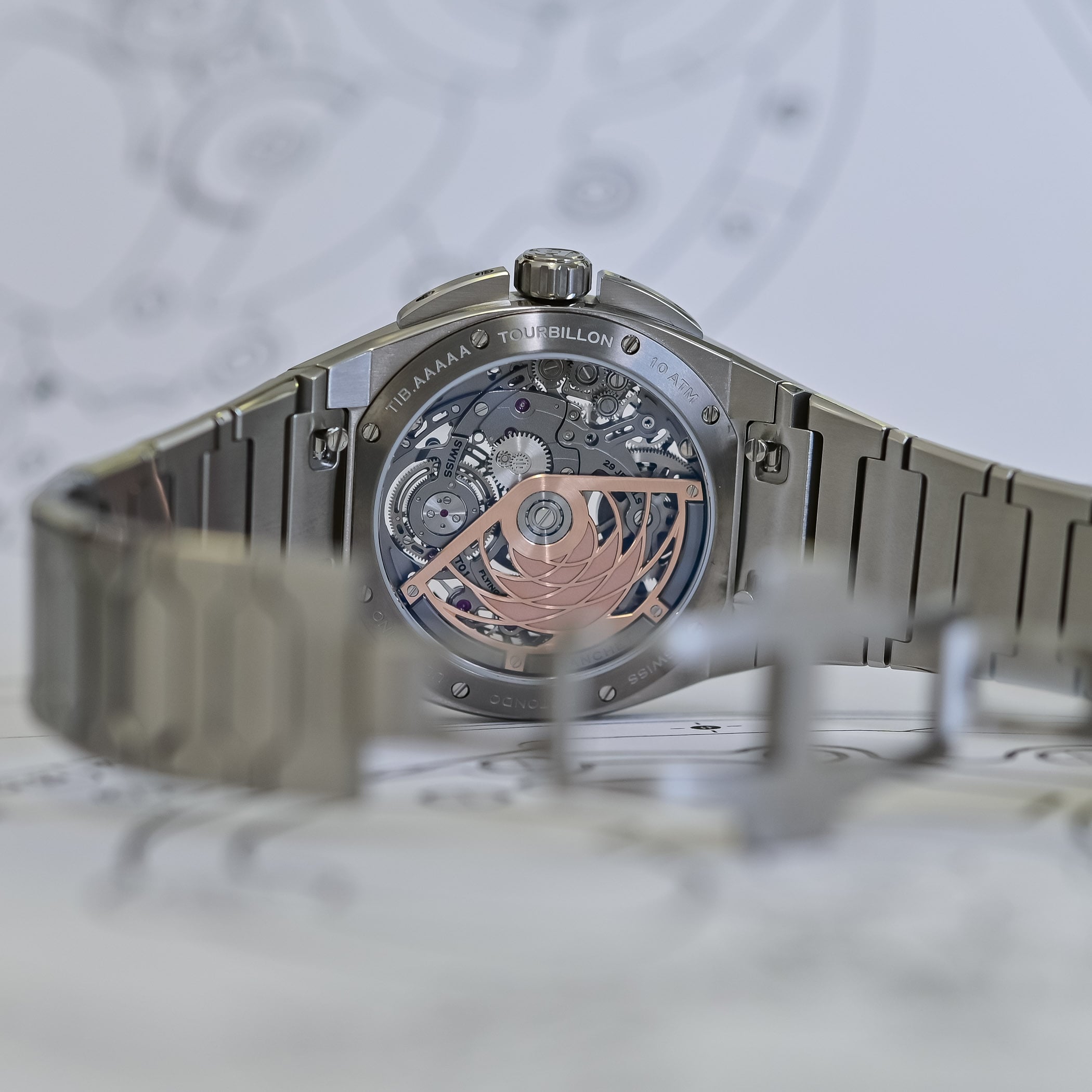 The Bianchet Ultrafino Rotondo Flying Tourbillon comes on an integrated bracelet matching the material of the case. A spare rubber strap is supplied. A release system on the back allows you to swap between the bracelet and strap in seconds (Editor’s Note: the interchangeability system on our pictures is not the one that will be used for production, which will be more elaborate). The bracelet combines H-links with faceted middle links and tapers down to a narrower width at the folding buckle. The price is set at CHF 62,500 (excl. taxes) for the titanium version and CHF 67,500 (excl. taxes) for the carbon version.