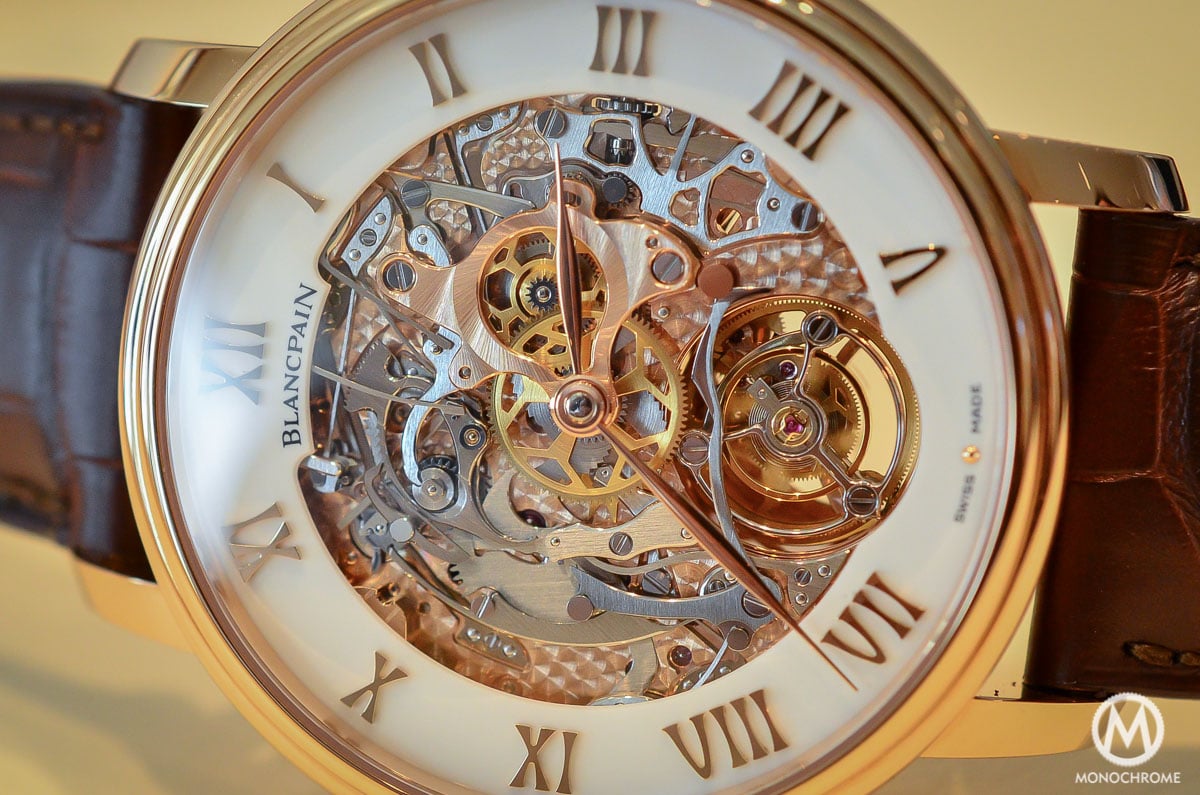 You know us at Monochrome-Watches, we love complicated watches and Haute-Horlogerie. We love exotic displays, we crave for independent watchmakers and their audacious creations, we could barely cry in front of a grande complication. With the watch we’re going to test today, we found something that can easily fulfill our needs: a one-minute carrousel (a sort of tourbillon) and a minute repeater together with a superbly finished skeletonized dial and an automatic winding. Here is the Blancpain Carrousel Minute Repeater Le Brassus, one of the most complicated timepieces of the manufacture.