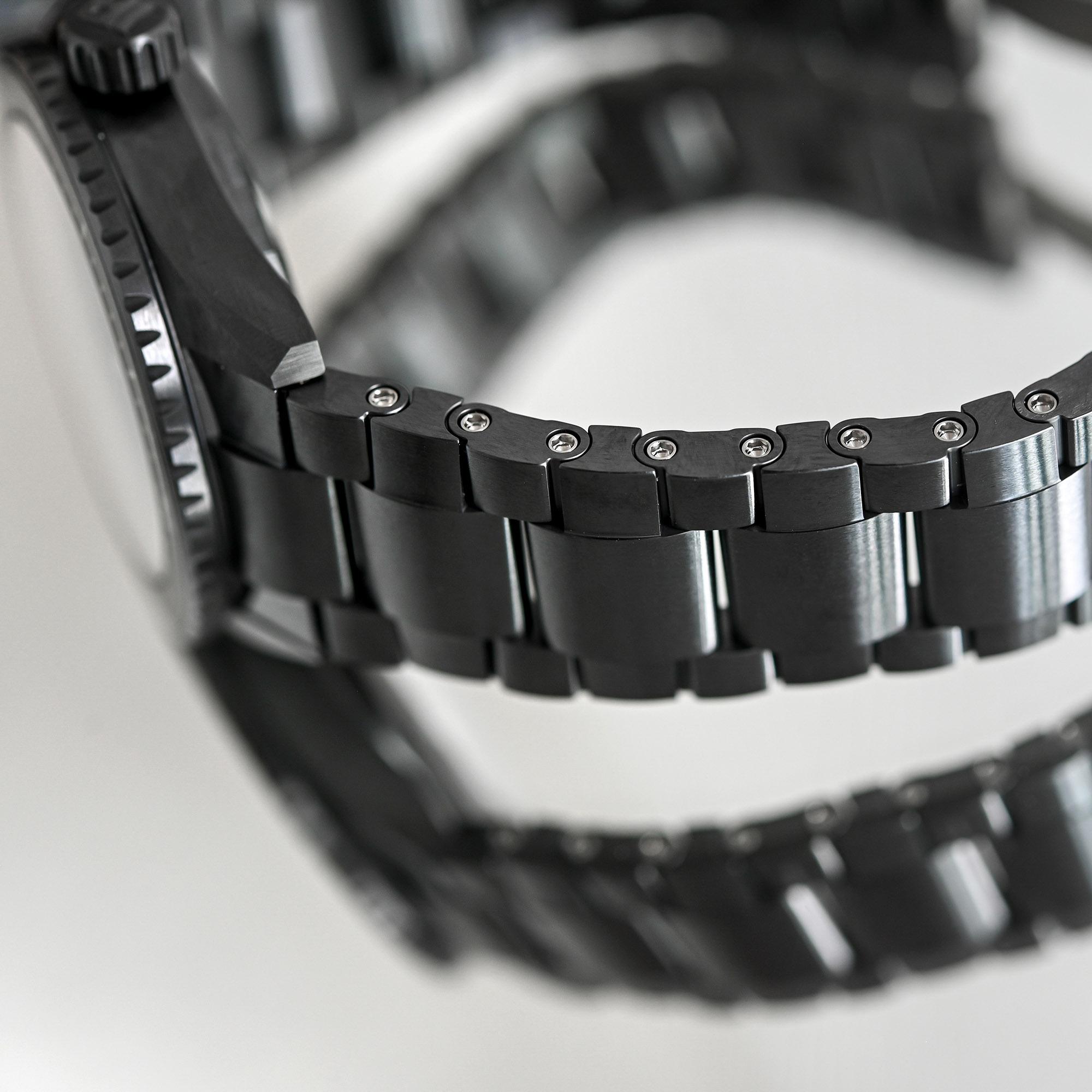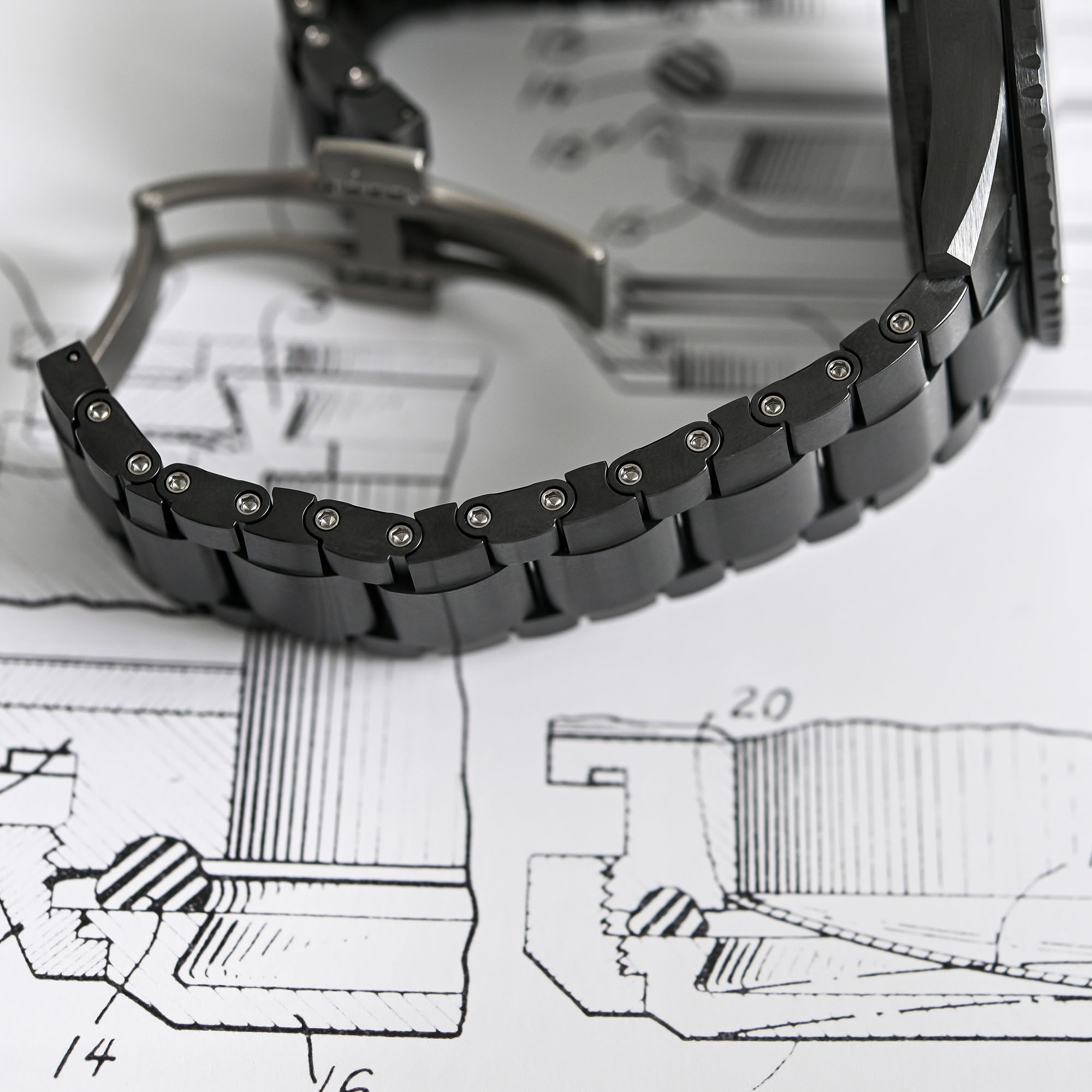 Blancpain presents a full black ceramic bracelet, shaped and finished in the same way as the bracelet found on its titanium models. The base material is produced locally in Switzerland by one of Swatch Group’s companies (Comadur) and then finished in-house. What makes a ceramic bracelet for the Bathyscaphe so complex is that all links are different in shape and size, designed to guarantee ideal ergonomics and comfort. The bracelet tapers from the lugs to the buckle, and all links have to be manufactured individually. The links are connected by a patented mounting system using cam-shaped pins for greater resistance to wear. The bracelet is closed by a titanium triple-folding clasp.