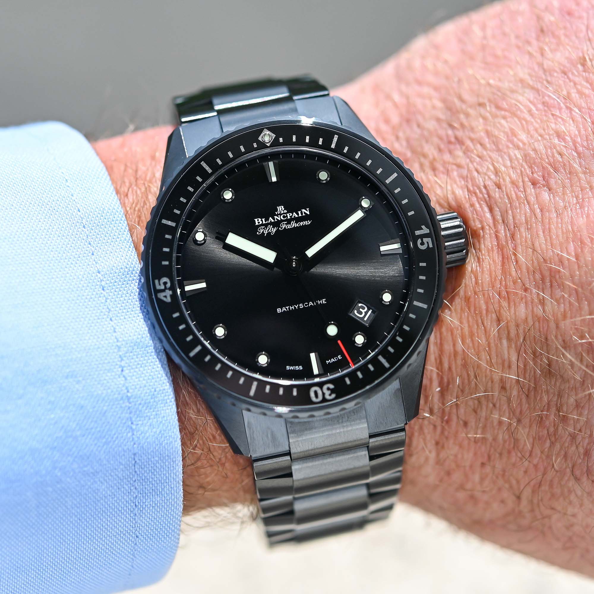The Bathyscaphe is Blancpain‘s more compact and streamlined version of the Fifty Fathoms, which was first released in 1956. Since its reappearance in the collection in 2013, marking the 60th anniversary of what was one of the very first dive watches ever created, it has appeared in many iterations. We’ve seen this watch in different sizes, different materials and equipped with all sorts of complications, such as a chronograph, an annual calendar or a complete calendar with moon phase. Following the evolution of the collection that was implemented recently in the time-and-date version, also seen on the chronograph and the Quantième Complet, it is now time to introduce new materials to this collection, starting with a surprising blue-on-black, full ceramic edition of this calendar dive watch. But first, let’s talk bracelets…