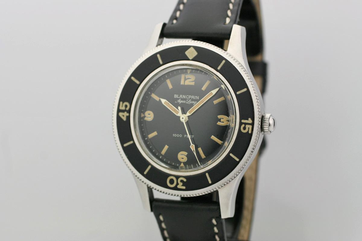 In addition to the smaller diameter, thinner rotating bezel and thick rectangular indices that distinguished it from the mighty Fifty Fathoms tool watch, the Bathyscaphe featured a date window. Below, some examples of vintage Blancpain Fifty Fathoms watches, including the model that inspired the present watch reviewed (on the left):