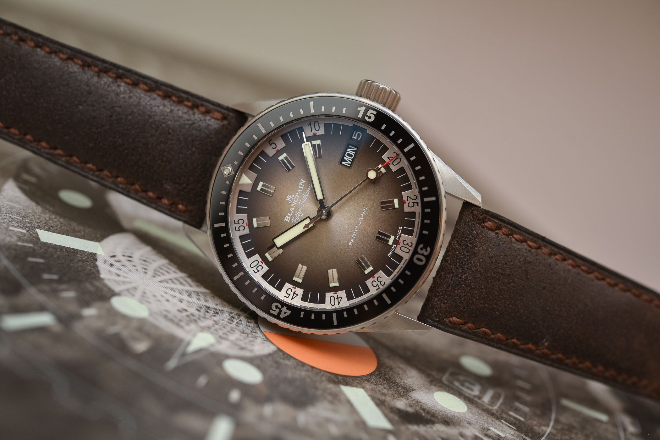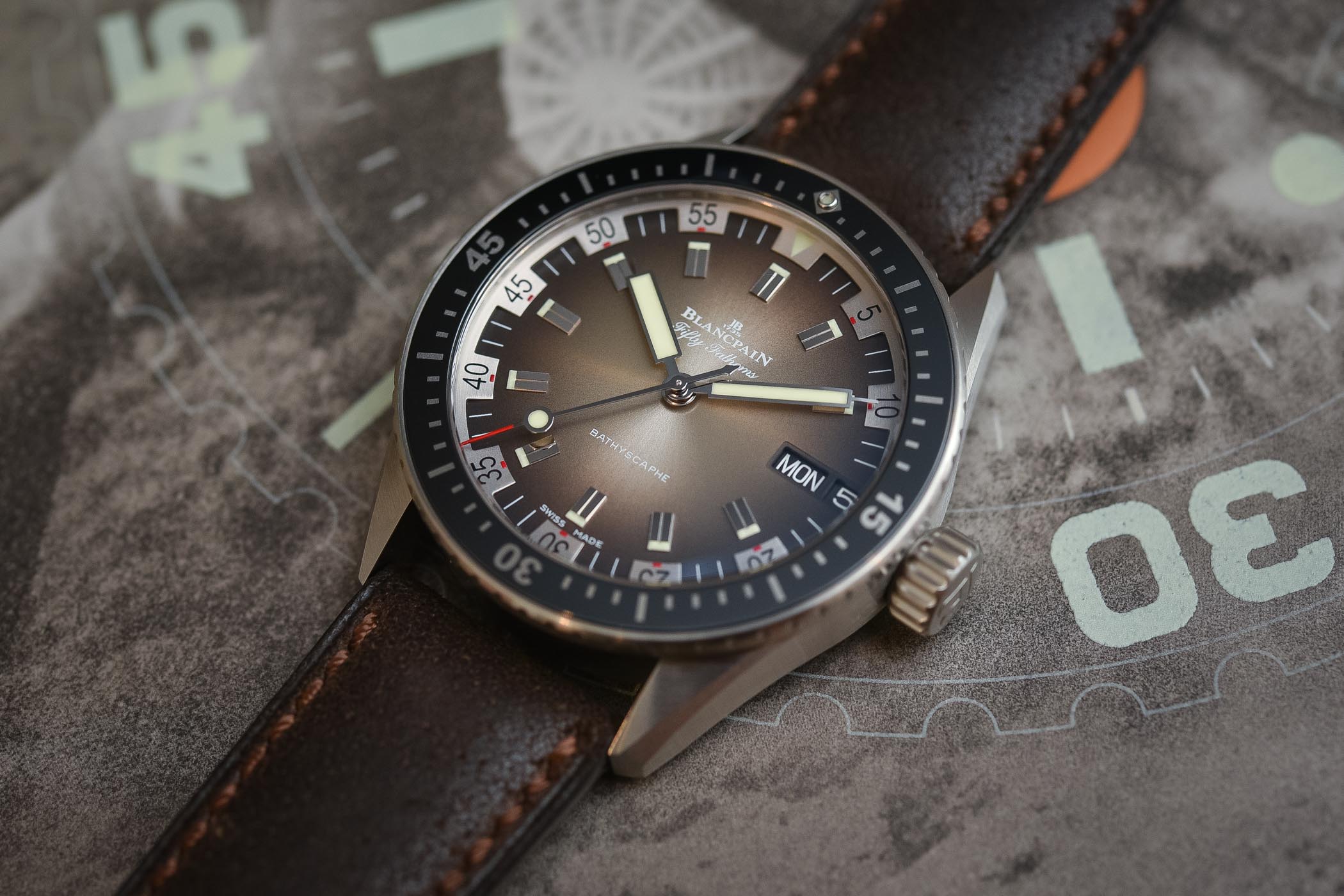 Our hearts literally melted when we saw the gorgeous, almost faded effect of the Bathyscaphe Day Date 70s dial. The graduated grey-brown colour intensifies towards the periphery but, when it is worn – and depending on the light conditions – the dial changes from a warm brown colour to a cooler anthracite grey. The layout of the dial is a close replica of Blancpain’s 1970s muse with bold chunky hour markers and an unusual minute track in a steely-silver colour with large Arabic numerals at five-minute intervals and red squares at the base of every numeral.
