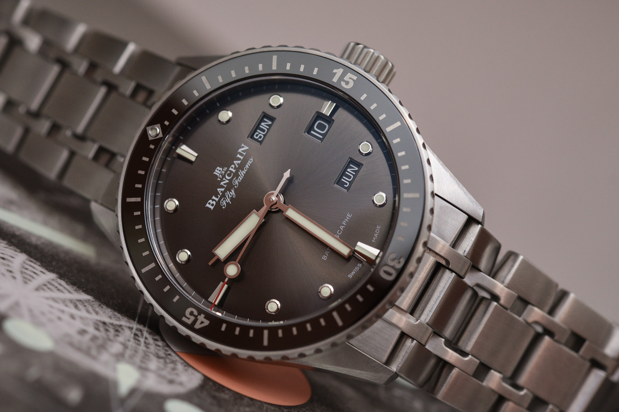 On the rear side of the watch, a sapphire caseback shows off the new Caliber 6054-P. An in-house movement, it is based on Blancpain’s existing twin-barrel Caliber 1150 and features an integrated annual calendar complication. According to Blancpain, the bridges have been extended to create a wider opening on this automatic movement, which offers a 72-hour power reserve when fully wound. Finishing, much like the watch itself, is technical and subdued although still executed to Blancpain’s high standards.