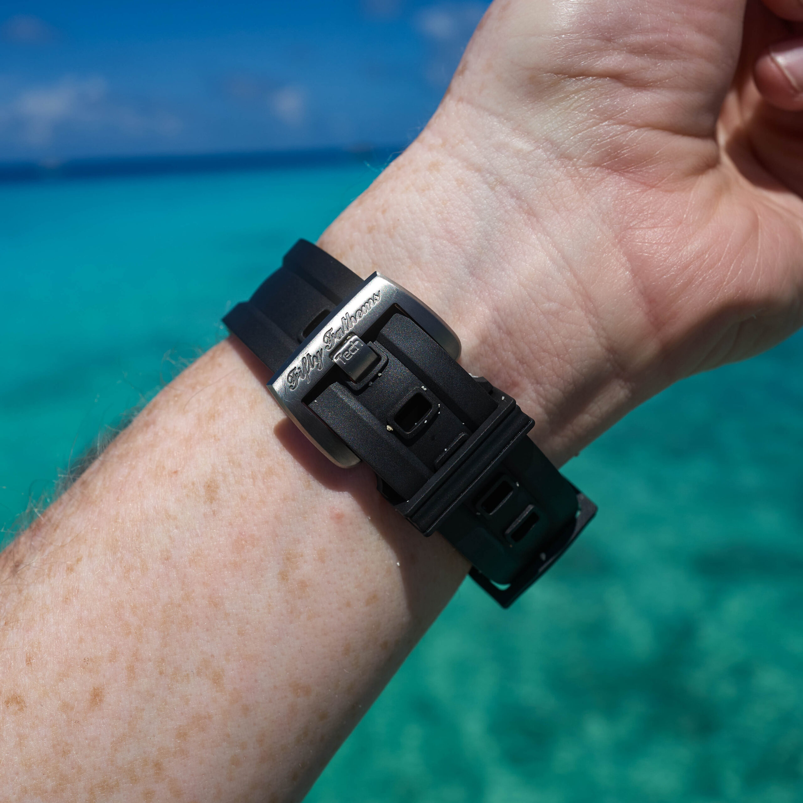 On the wrist, the watch wears like a dream. The rubber strap is soft and supple and the lack of lugs and the subtle curvatures of the case make it hug the wrist like that’s where it’s supposed to live. The dial layout is very legible and the separate functions of the watch are colour-coded: the time-telling features, such as the hour and minute hand and indices around the dial are all in orange, while the timing features, the three-hour hand, second hand, and scale around the bezel are all done in white, making it very easy to quickly parse whatever data it is you desire. Unless that data is the date, as you will not find that info here. I think the exclusion of the date was a good call, as it keeps the dial clean and symmetrical. If you’re spending hours at the bottom of the ocean counting coelacanths, do you really need to be thinking about what day it is? I think not. Now let’s go rebreather diving!