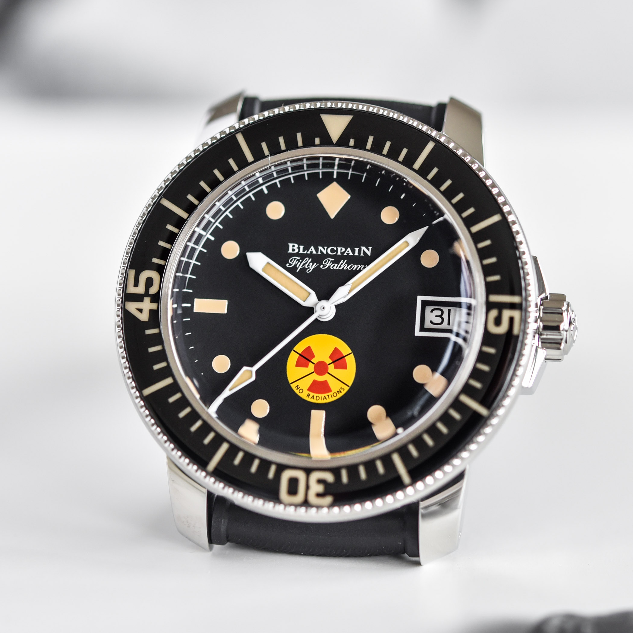 This year, Blancpain presents another commemorative watch, paying tribute to some of the most sought-after and rare editions of its iconic dive watch, the Fifty Fathoms. Following the Tribute To Fifty Fathoms MIL-SPEC in 2017, the “Nageurs de Combat” Limited Edition and the Barakuda Re-Edition both in 2019, we now have a new edition of the Fifty Fathoms with a “No Radiations” dial, the new Blancpain Tribute to Fifty Fathoms No Rad. And yes, there are some major differences with the edition of 2010.