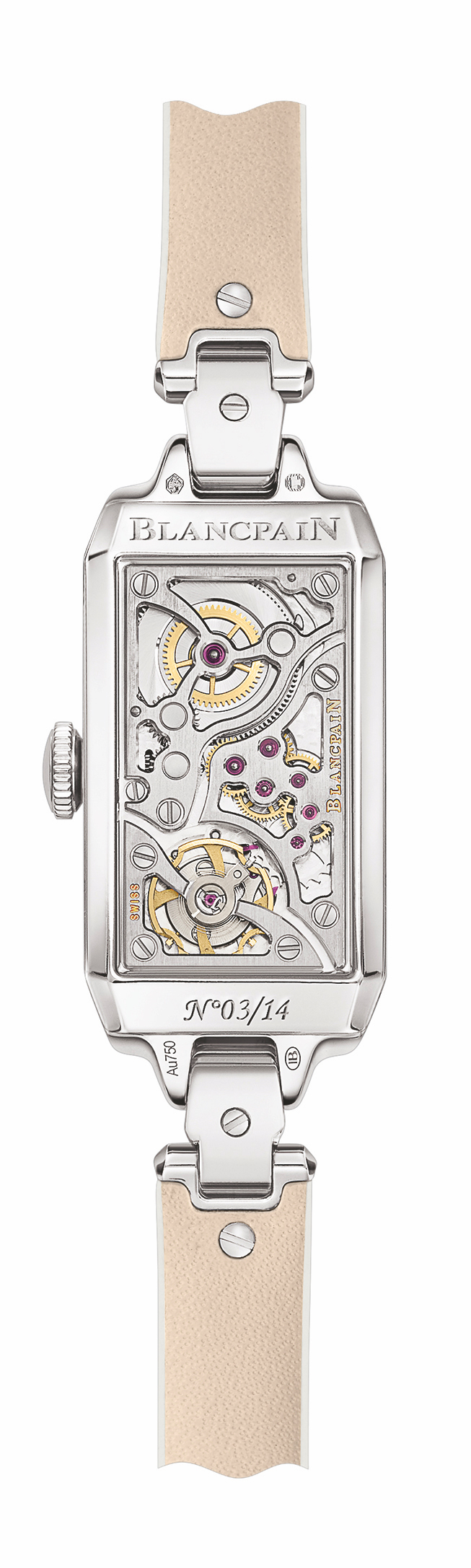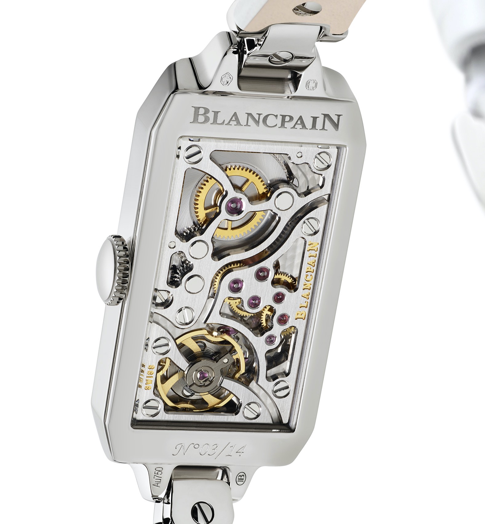 This rectangular manual-winding calibre constitutes a major addition to Blancpain’s repertoire of movements. The sapphire caseback reveals the 25.20mm x 12mm movement with a height of just 2.60mm and a 52-hour power reserve. This is a particularly generous power reserve for such a small movement.