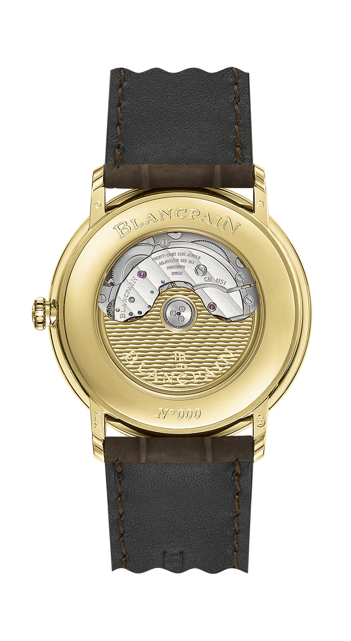 The 40mm case of this Blancpain Villeret Extraplate, as you’ve guessed from its name, it sleek and slender with an 8.70mm profile. The shape remains traditional with a stepped bezel and short, thin lugs which ensure a snug fit. Entirely polished, the case is made of 18k yellow gold, a somewhat forgotten tone of gold that is modernised with a dial that has nothing old-school about it at all. The case is equipped with two sapphire crystals and is water-resistant to 30 metres.