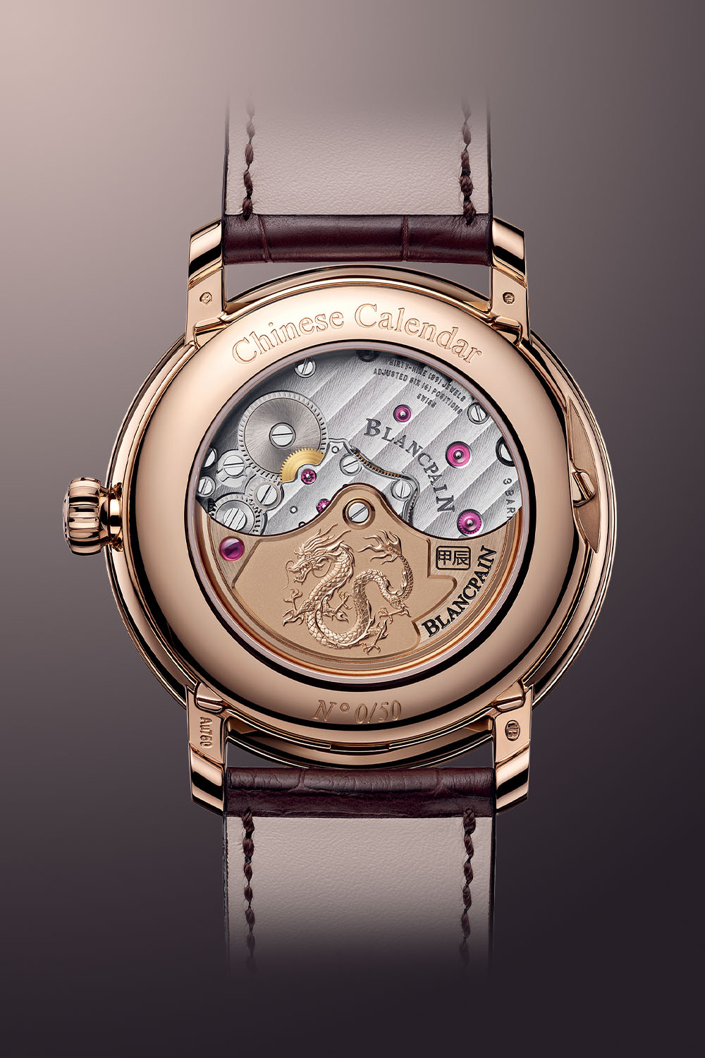 The watch is powered by Blancpain’s exceptionally complex calibre 3638. Comprised of 464 components and capable of delivering a mighty 7-day power reserve thanks to three series-coupled barrels, the automatic movement beats at 4 Hz and is equipped with a silicon balance spring. Traditional finishings decorate the movement, and the red gold rotor features a beautifully engraved figure of the Wood Dragon flanked by a red ruby.