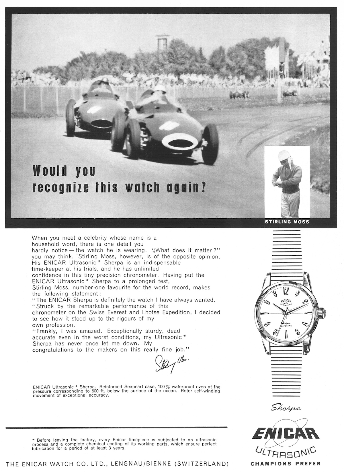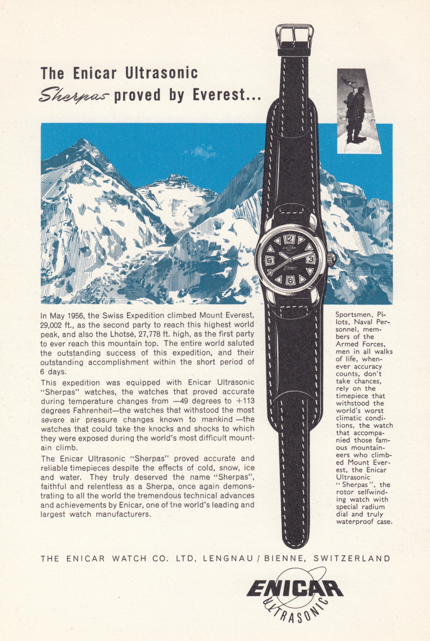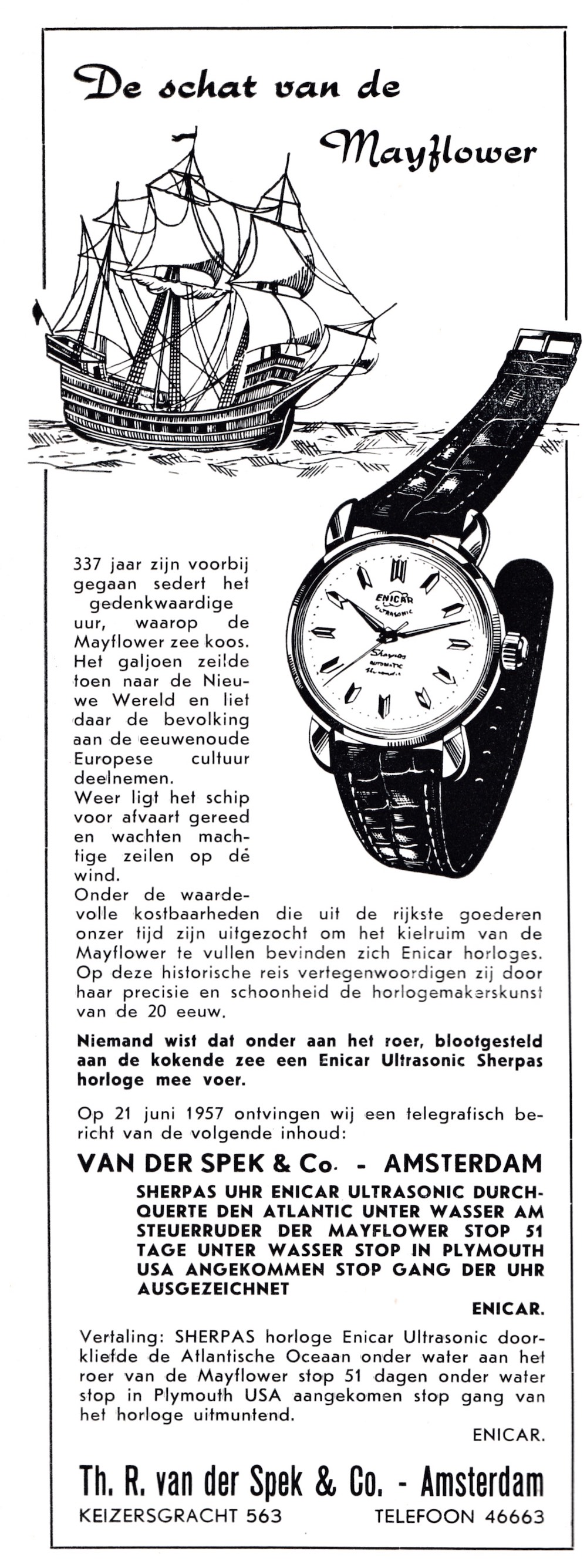 Van der Ven mentions a couple of marketing stunts Enicar did. ‘We all know Rolex was on the Mount Everest in 1953. Soon after, Enicar did pretty much the same with a watch they gave the name Sherpa, introduced in 1956. In 1957 they went a step further with that watch. An Enicar Sherpa was attached to the bow of the Mayflower II ship, which went sailing from England to New York. After this 51 day trip, the product manager of Enicar took the watch from the bow and inspected it. No water damage, and no time lost.’