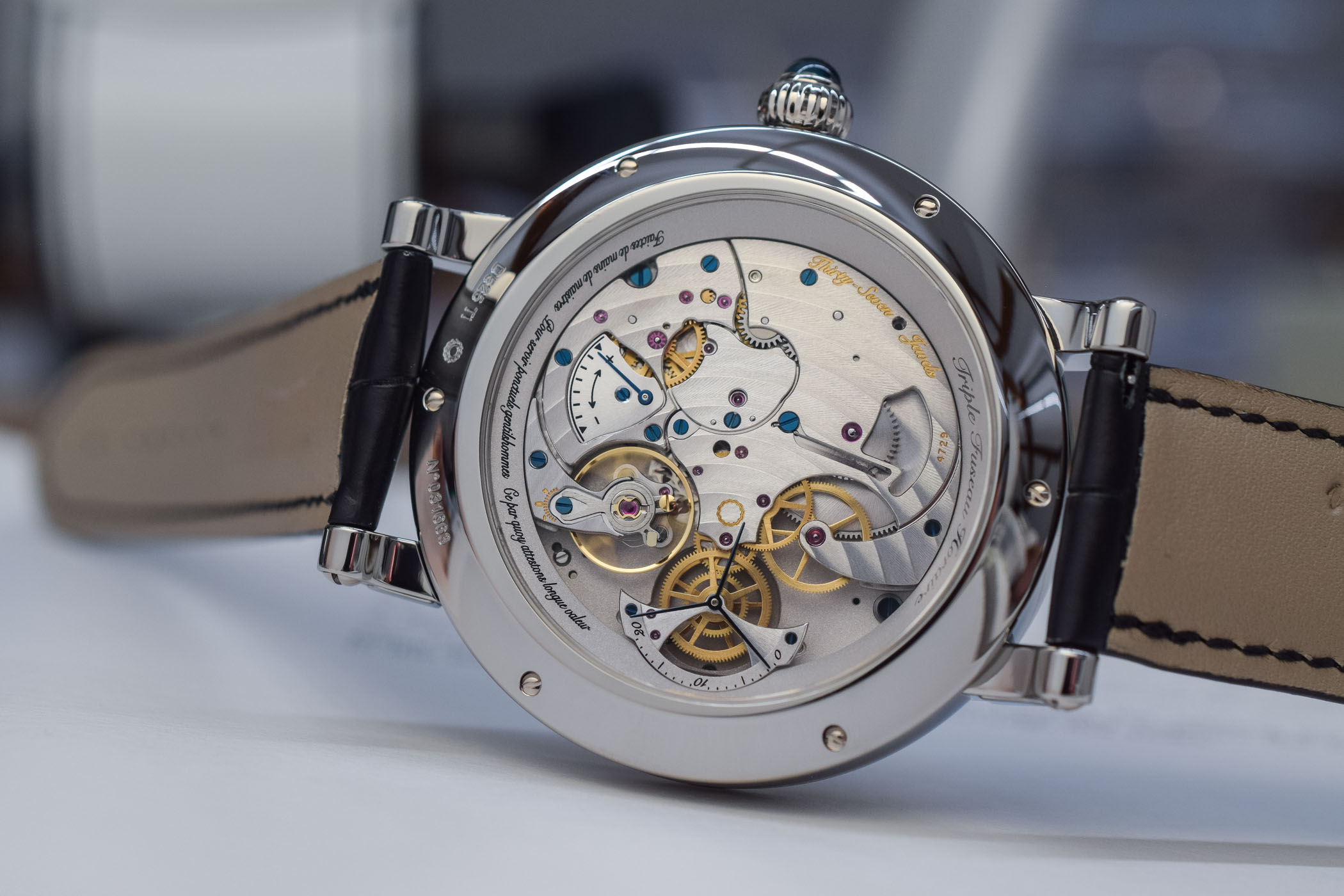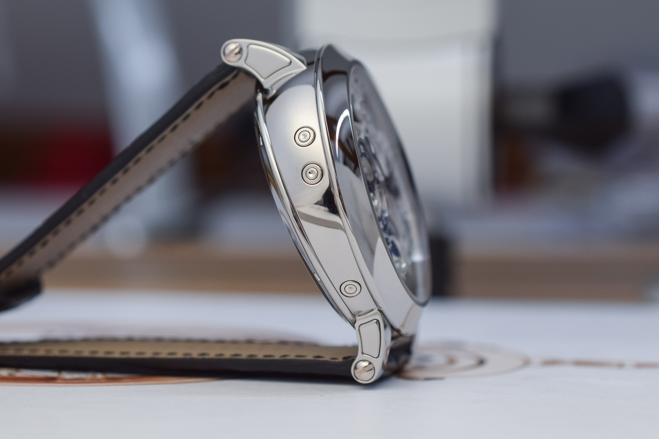 On the wrist, as you can imagine, this attention-grabbing watch has a strong presence. The “writing slope” case and the 3-dimensional architecture of the openworked mechanism create a striking sense of depth. Still, the Bovet Recital 27 tends to wear smaller than the 46mm diameter would suggest. Turning the watch over, the exhibition caseback offers an unimpeded view on the hand-wound movement with seconds and power reserve indication, with 7 days of energy stored in the movement. The hand-wound calibre 17DM04-3FPL stands out with its symmetrical architecture, fine anglage and circular Geneva stripes.