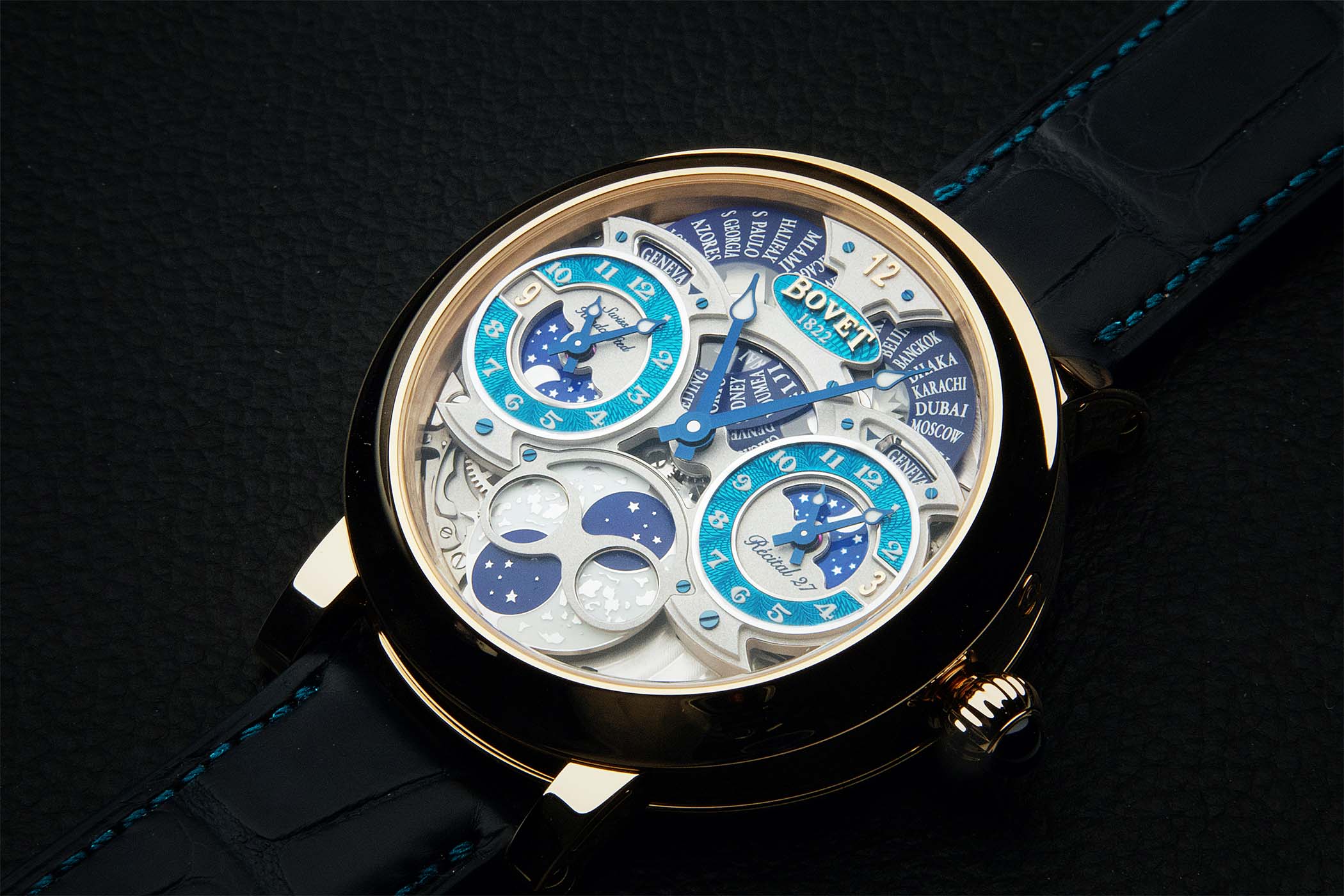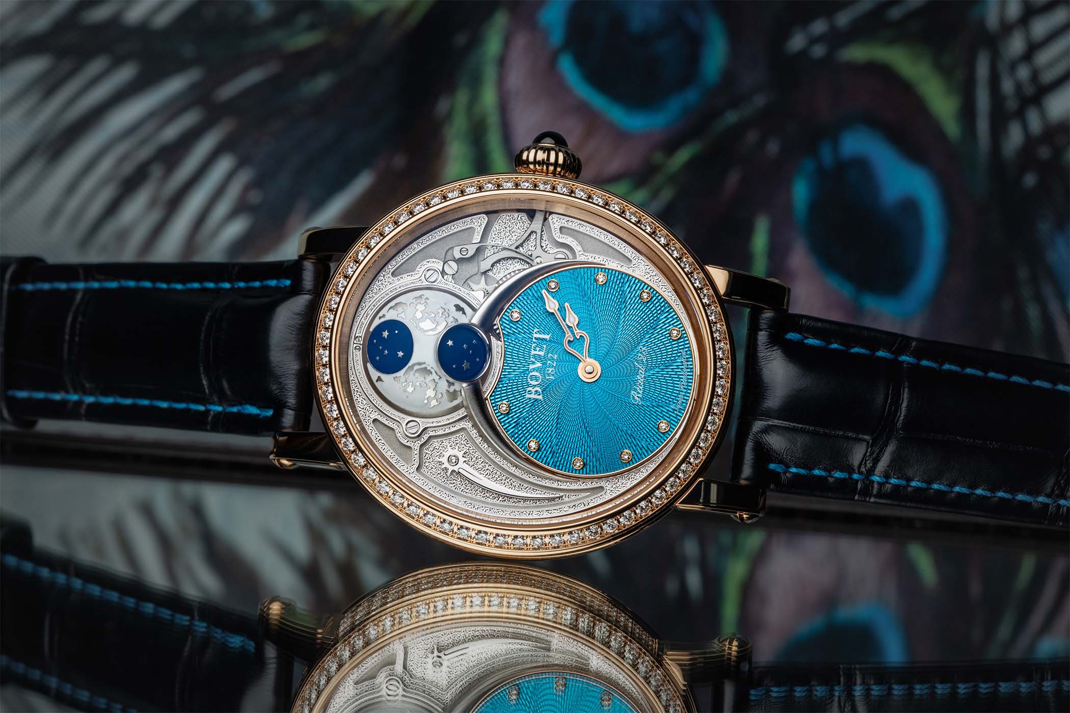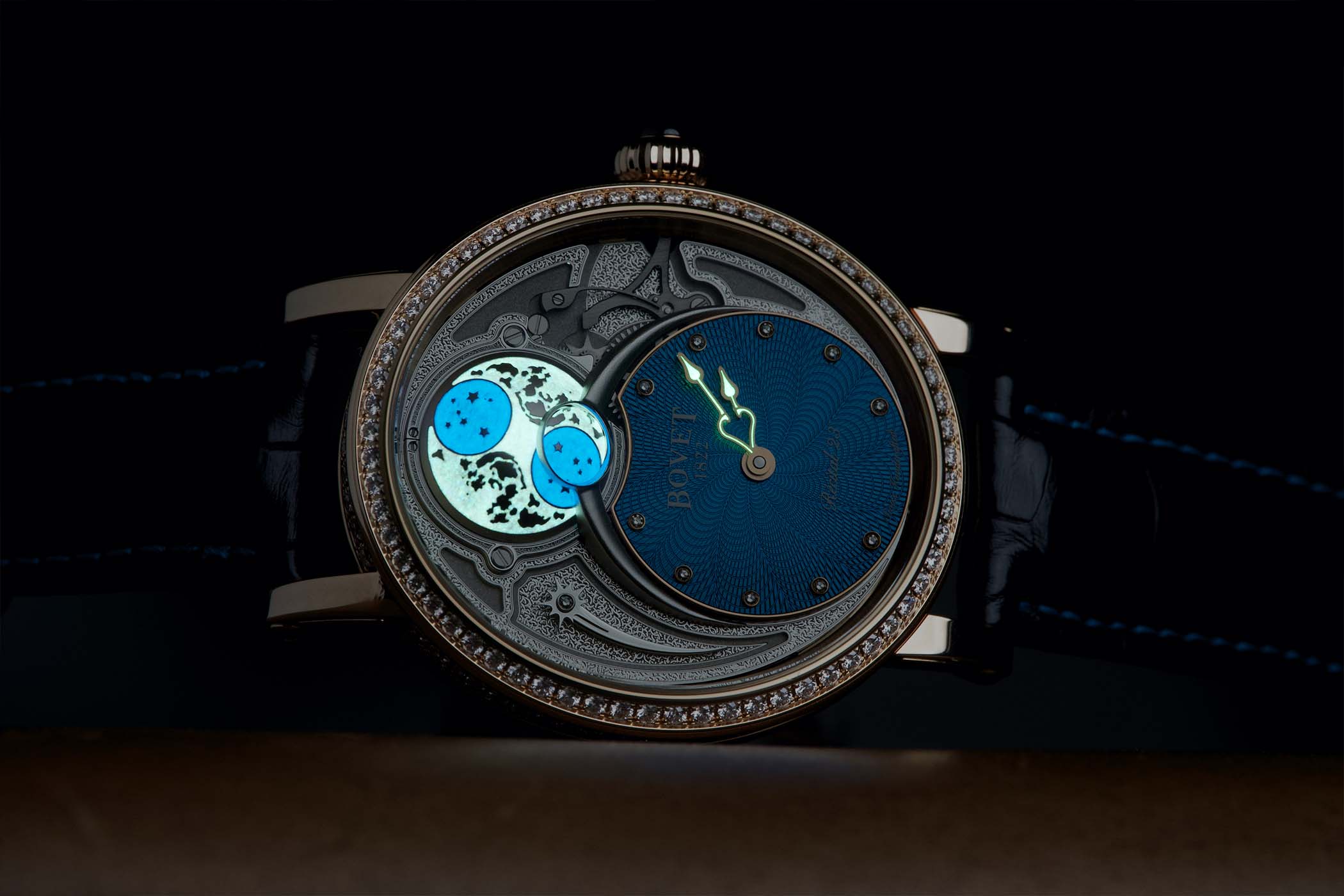 The turquoise guilloché with a lotus flower motif is applied to the Bovet 1822 cartouche at noon and to the two sub-dials at 3 and 9 o’clock. Even the screws and the stitching on the strap pick up on the colour scheme.The tips of all the hands and the surface of the Moon are treated with Super-LumiNova. The manual-winding movement, visible through the caseback, is impeccably finished by hand.
