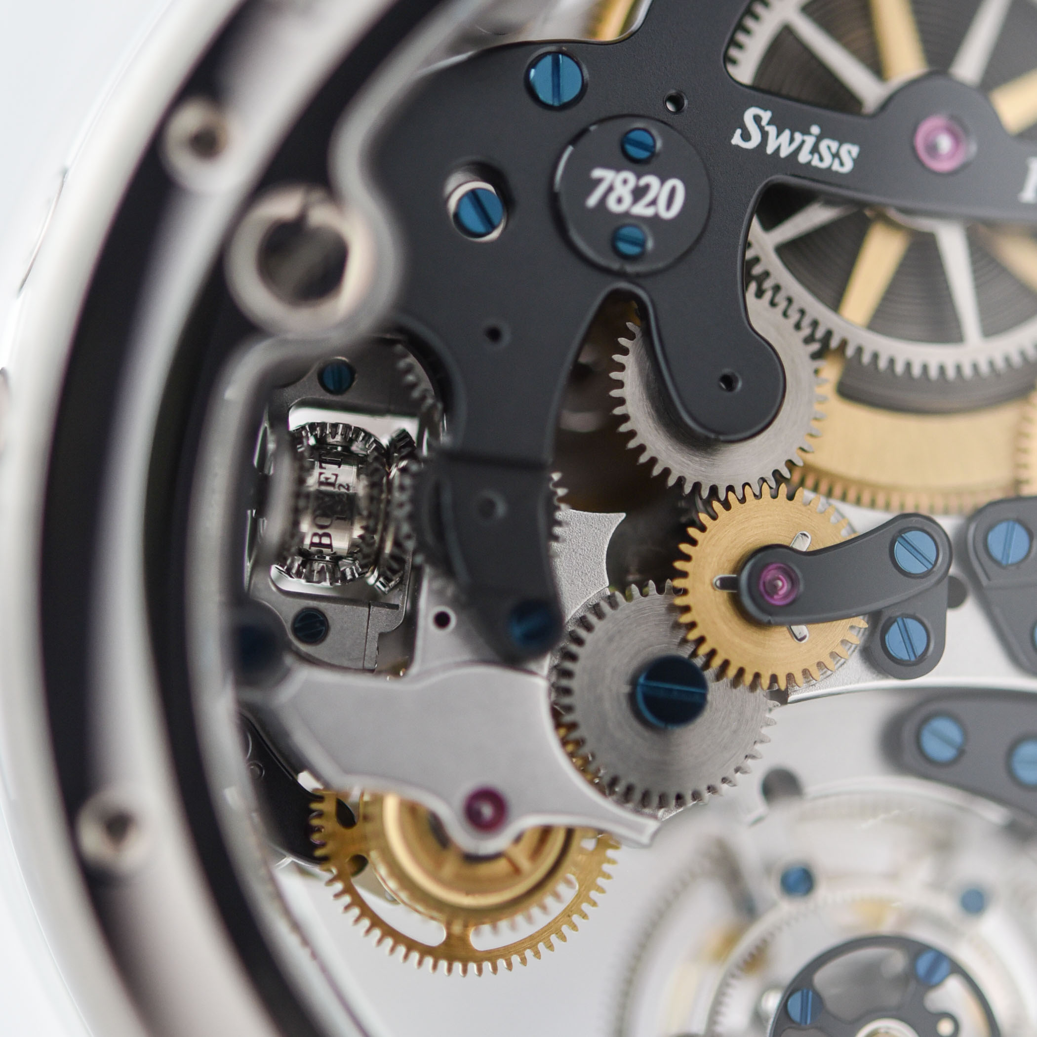 When viewed from the side, you can appreciate how the manual-winding movement’s atypical construction matches the inclination of the sapphire case. With its stepped architecture and succession of inclined planes, each indication hinges on an axis perpendicular to the bezel’s inclined plane. What this arrangement means is that you get the best legibility possible and the most natural angle to view the show.