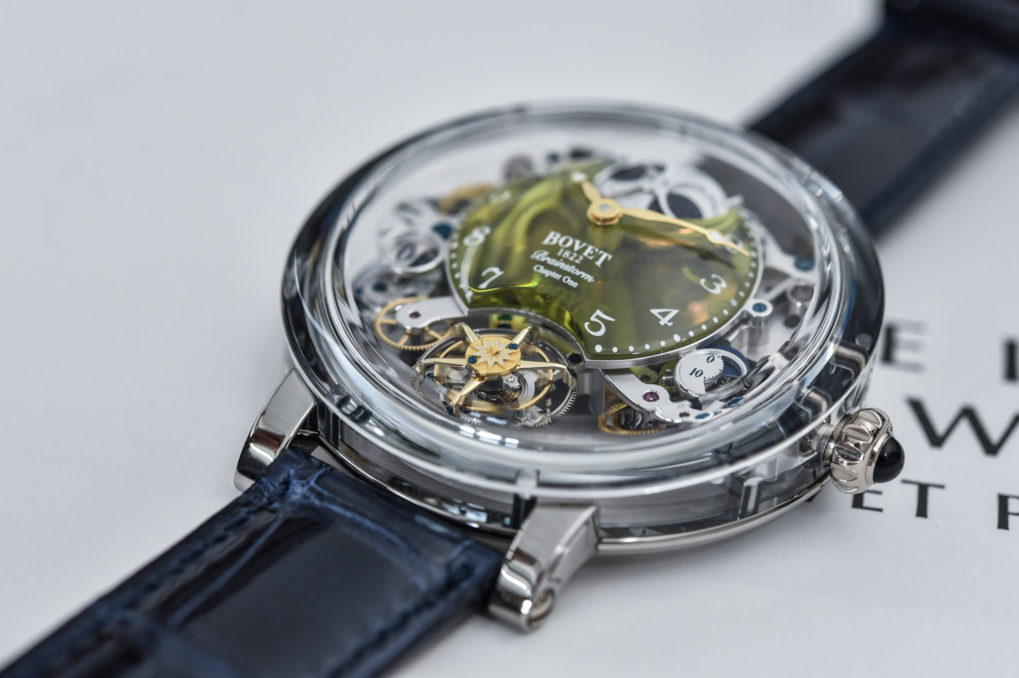 Measuring 48mm in diameter with a case thickness of 15.50mm, the sapphire crystal case is supported with titanium lugs and a titanium caseback, materials known for their lightness. Looking at the watch from the side reveals the quite pronounced inclination of the case. If you want to find out more about the challenges faced by Pascal Raffy’s team to construct and polish the inclined sapphire crystal receptacle, don’t miss MONOCHOME’s exclusive video here. Also, if you are wondering whether Chapter One has a sequel, check out the even more complex Chapter Two watch reviewed here.