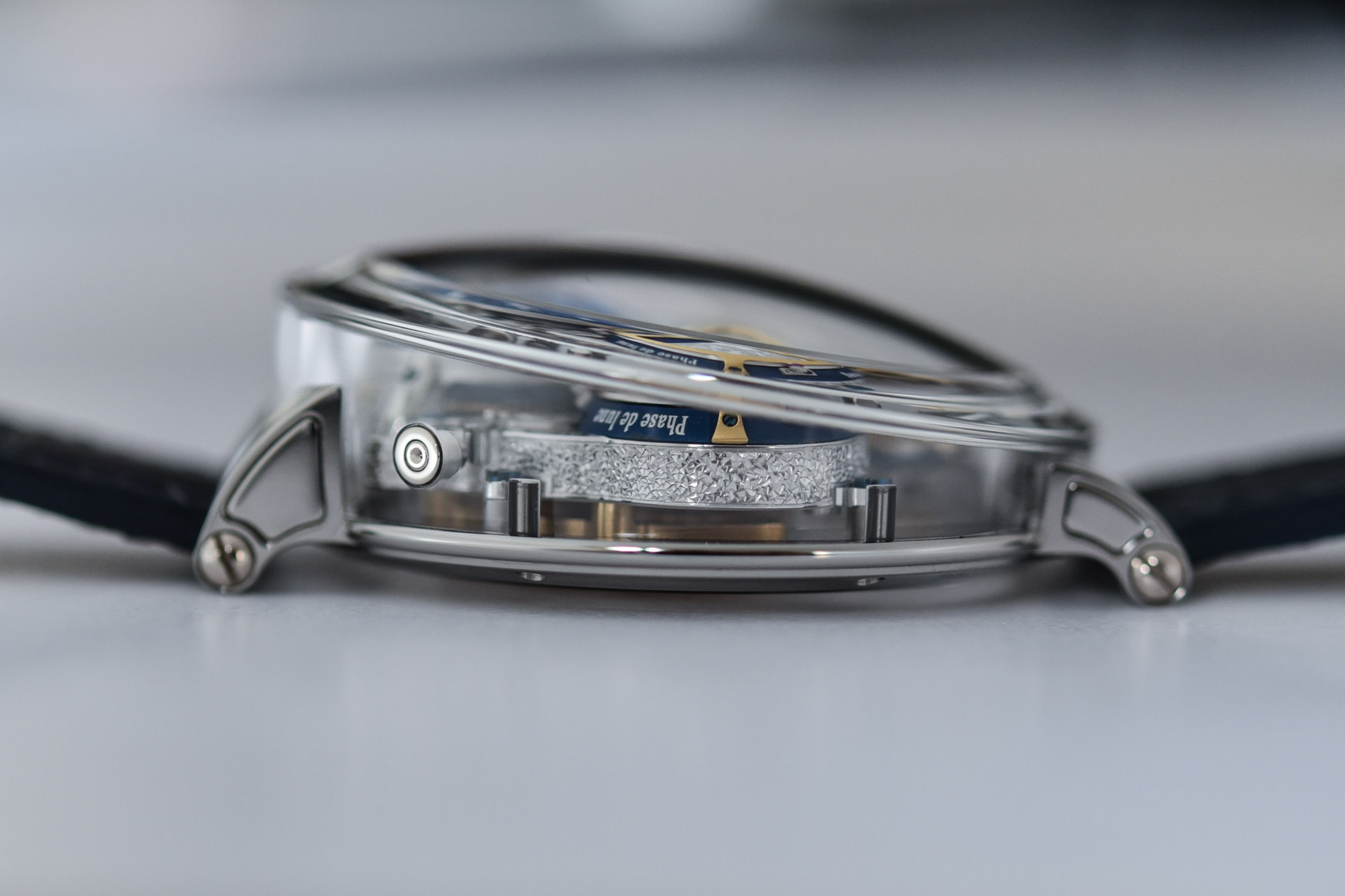 Sapphire cases are not new in watchmaking. However, the intrinsic hardness of sapphire makes it notoriously hard to machine and polish. After all, sapphire is the second hardest material after diamond. Other properties of sapphire are its crystalline transparency and its weight that is lighter than titanium. The case, which has a formidable 47.80mm diameter and a thickness of 15.50mm at its highest point, is made from sapphire and reinforced with a grade 5 titanium ring on the caseback and titanium lugs. So yes, it is enormous, but at the same time extremely light.