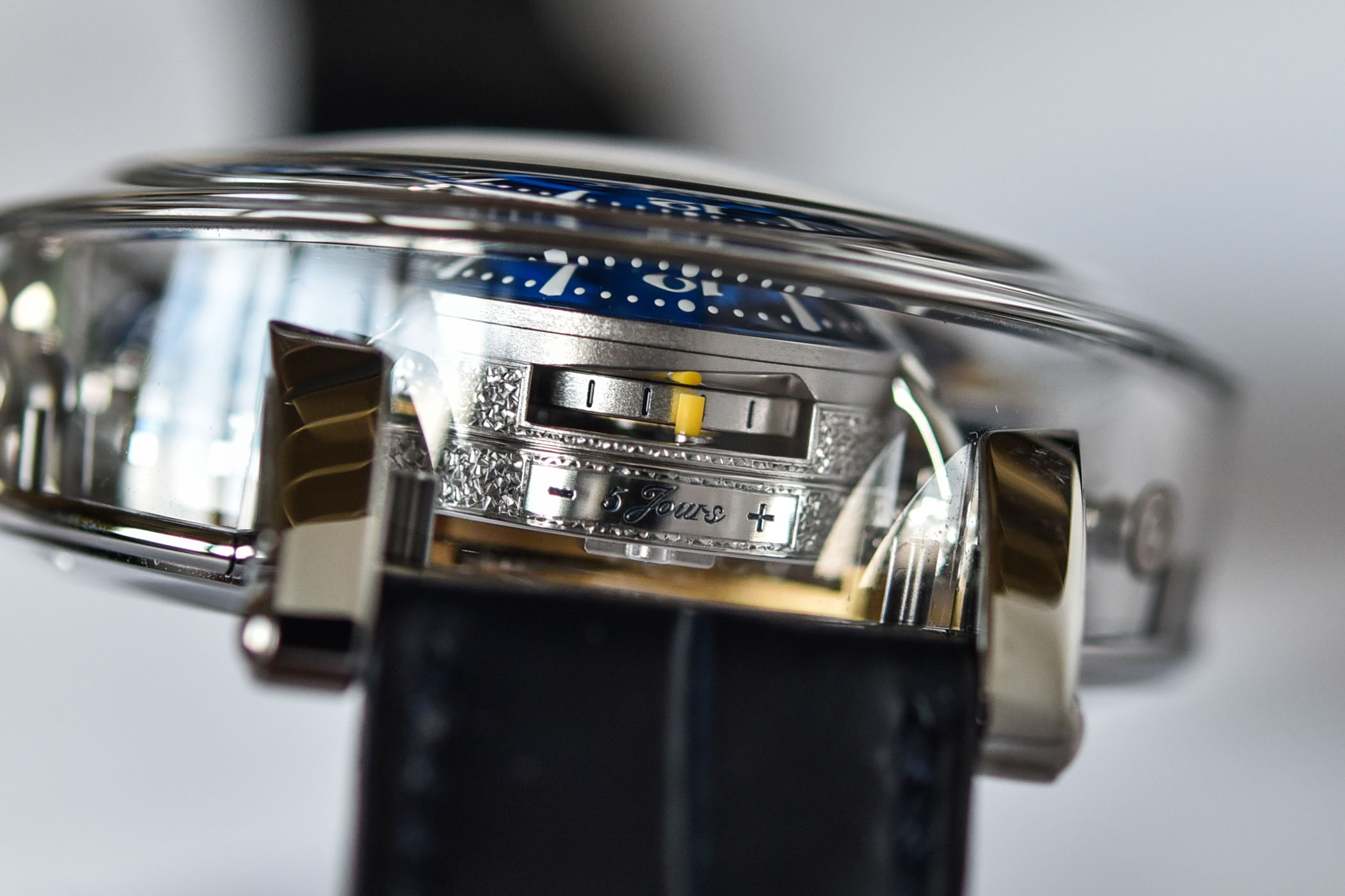 The power reserve indicator is not on the dial or on the caseback. It is at the thickest, top part of the case nestled between the two lugs. The linear indicator with its yellow-tipped pointer is, in fact, integrated into the cylindrical supporting structure of the main time dome. The cylindrical structure below the time disc in tiered and on the bottom features a plaque with the engraving -5 Jours +. The next tier is set aside for the linear power display aperture.