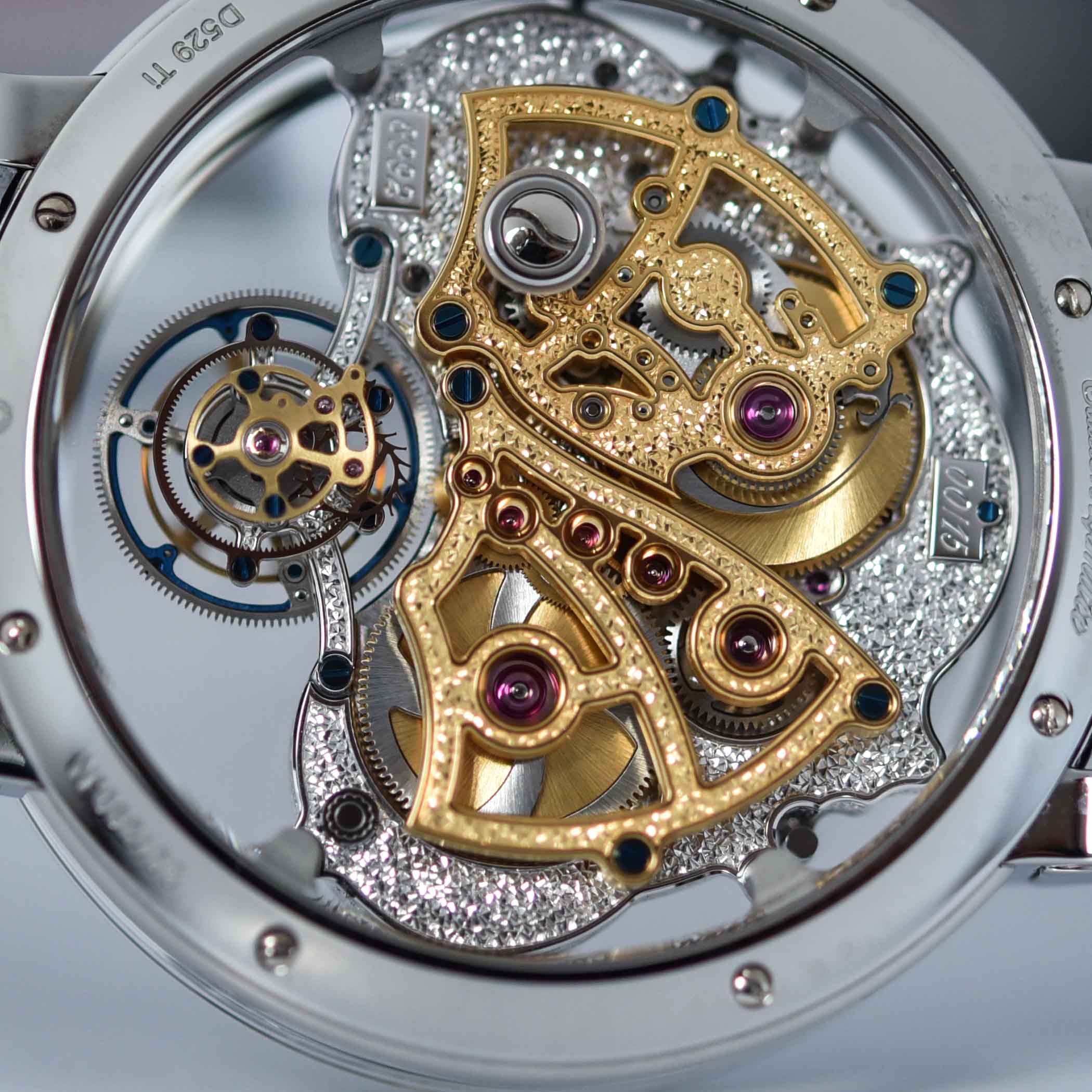 The view from the reverse is quite simply beautiful. The two golden openworked bridges in the centre seem to hover like butterfly wings above the silver structure that supports the domes. Unlike most movements, this one is fixed at the bottom rather than in the middle of the case to optimise transparency. Once again, the lovely broken glass hand-engraved pattern we found on the dial is used here to great effect. Even the double-barrel feeding the movement with its powerful 5-day power reserve is decorated with a golden propeller motif above a brushed silver base. The patented double-sided tourbillon is gracefully suspended in mid-air at 6 o’clock and held in place by two bridges fixed with turquoise coloured screws.