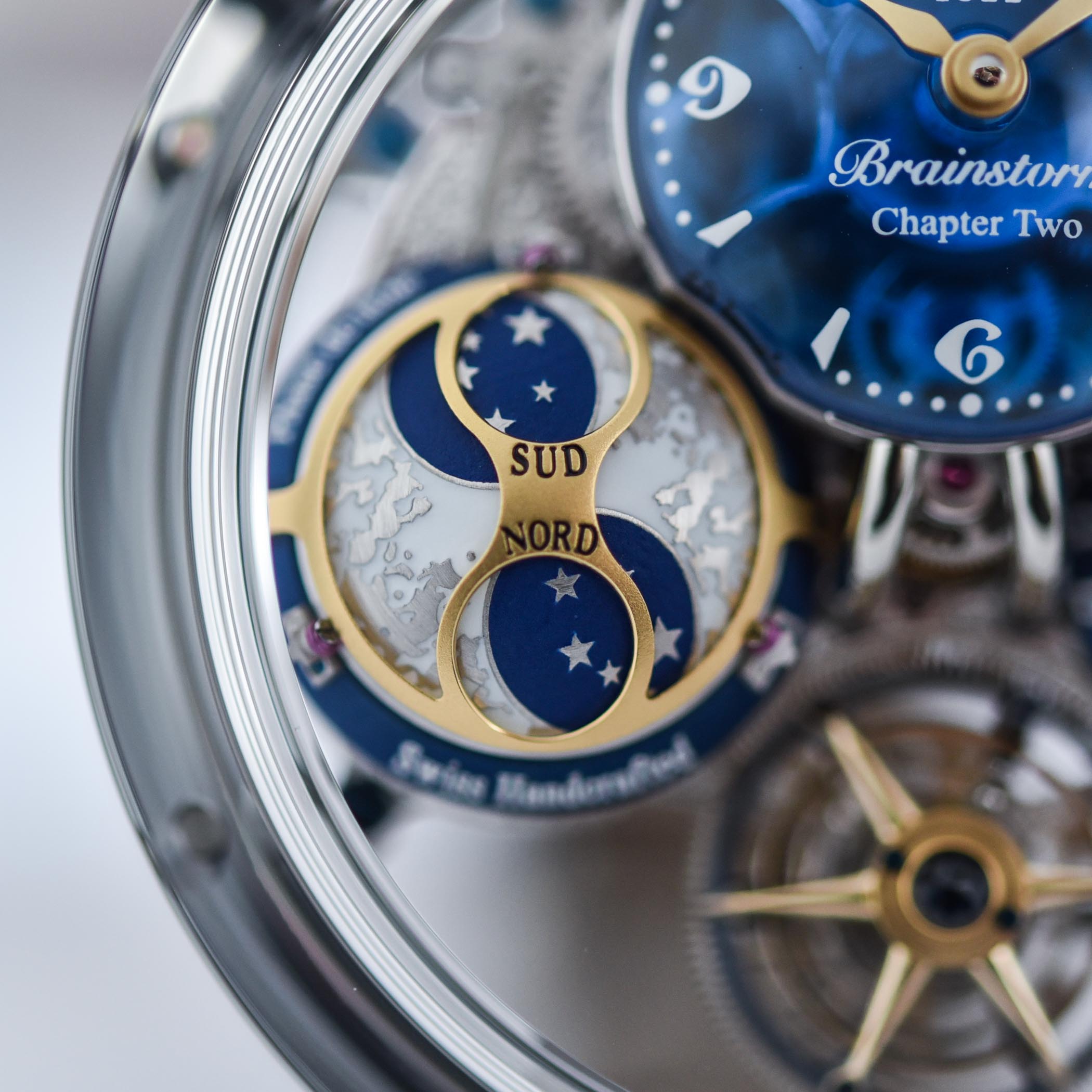 Earlier this year, the watch materialised in another colour scheme but with the same spectacular layout. While the sloping sapphire case of the Brainstorm Chapter Two is similar, the action on deck is even more spectacular, if possible! Admittedly, two of the complications hosted inside the sapphire case of Brainstorm Chapter Two, namely the double-sided tourbillon and the moon phases, were featured in the first Brainstorm model.