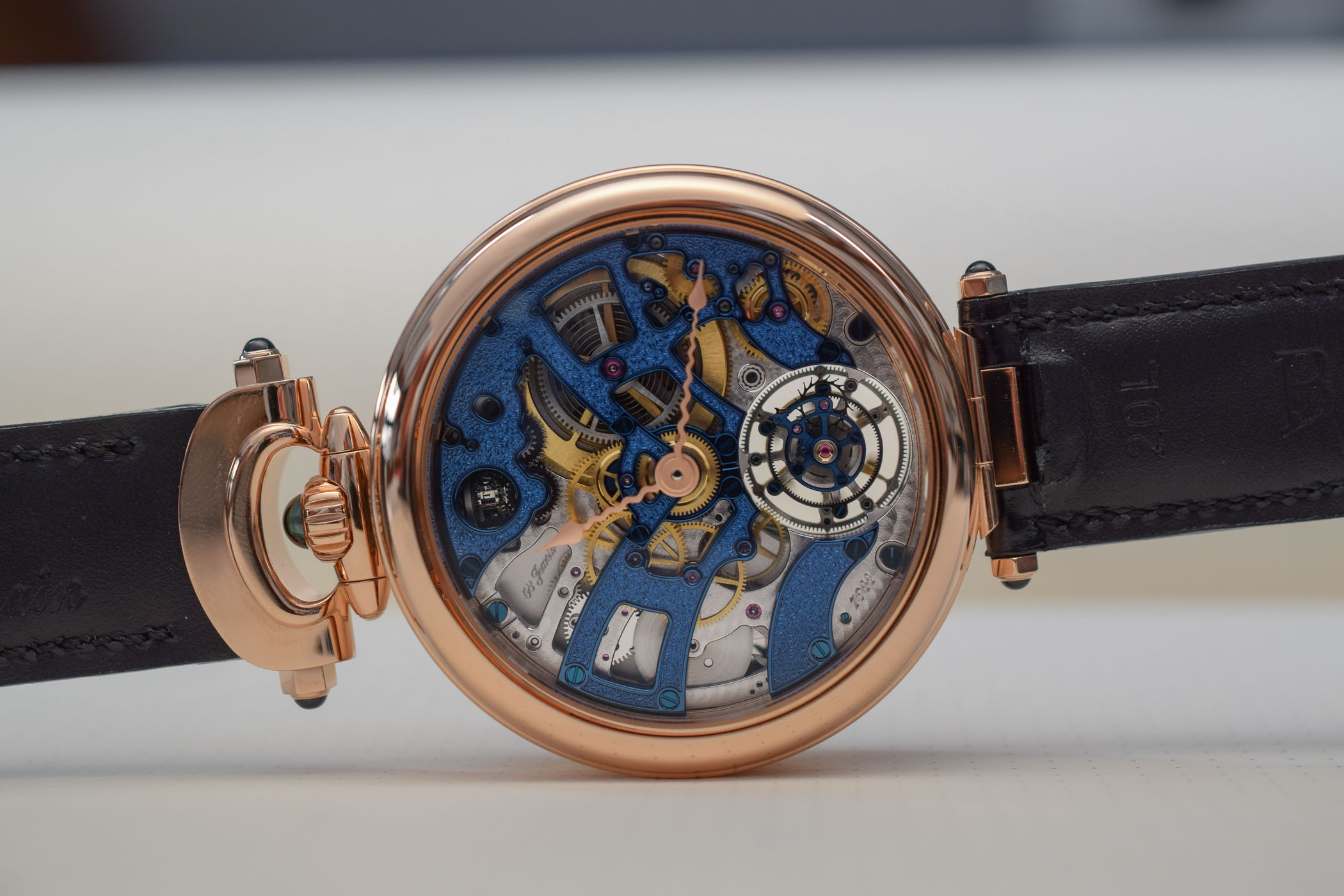 The two faces of the Virtuoso IX display decorative motifs and techniques inspired by some of the brand’s early pocket watches. Decorated with an elegant hand-guilloché fan motif on the base, the dial is treated to flinqué enamelling using eight layers of translucent lacquer. The intense blue tone and swirling motifs of the pattern on the dial evoke the richness of Bovet’s 19th century enamelled pocket watches. The reverse side reveals a network of bridges and features central hour and minutes hands over the movement and another view of the flying tourbillon. Designed to evoke the architecture of the bridges of 19th century Bovet movements, the surfaces of the bridges are engraved with a sparkling blue bris de verre motif.