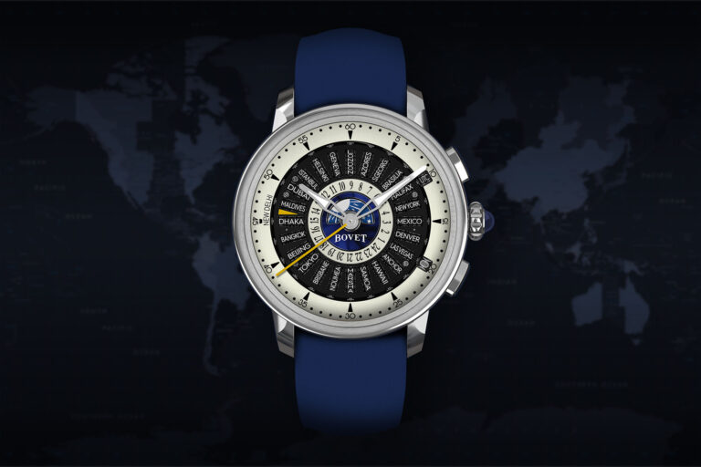 In 2010, Bovet introduced the Amadeo convertible case, allowing a watch to be used as a wristwatch, pocket watch or table clock without the need for tools. The 2018 Edouard Bovet Flying Tourbillon is an excellent example, marking 200 years since Edouard Bovet first left for China. The in-house movement (caliber 16BM04-TT) features a 10-day power reserve, triple time-zone (with hemispherical Earth maps) and double-sided flying tourbillon, and they even manufacture the hairsprings via sister company Dimier. Two hemispherical domes representing the Earth provide additional 24-hour time zones and are engraved and lacquered by hand. The movement itself is intricately engraved with floral patterns and the upper dial features a blue lacquered guilloché pattern.