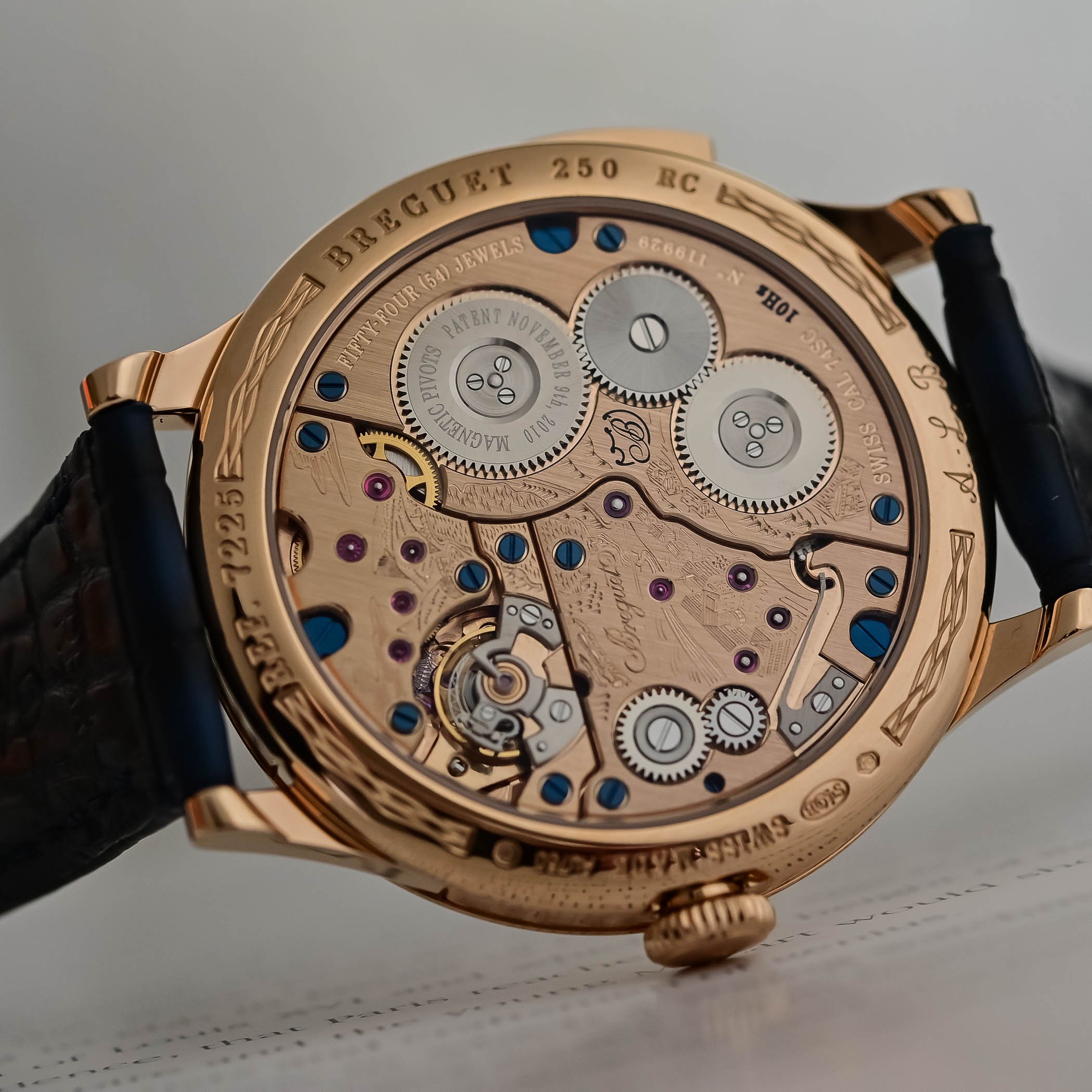 The thickness is a restrained 10.7mm. On the wrist, the watch feels broad but composed, keeping a distinctly elegant profile. The revised lug geometry allows the case to hug the wrist comfortably despite its 41 mm diameter. On a medium wrist, it sits flat, balanced, and distinctly elegant. The 18k Breguet gold (an alloy of gold, copper, silver, and palladium) used for the case has a tone that’s a little softer than the usual rose or yellow gold, giving the watch a warm hue that suits its purpose: a chronometer first, and a showpiece second. The 7225 is water-resistant to 30m.