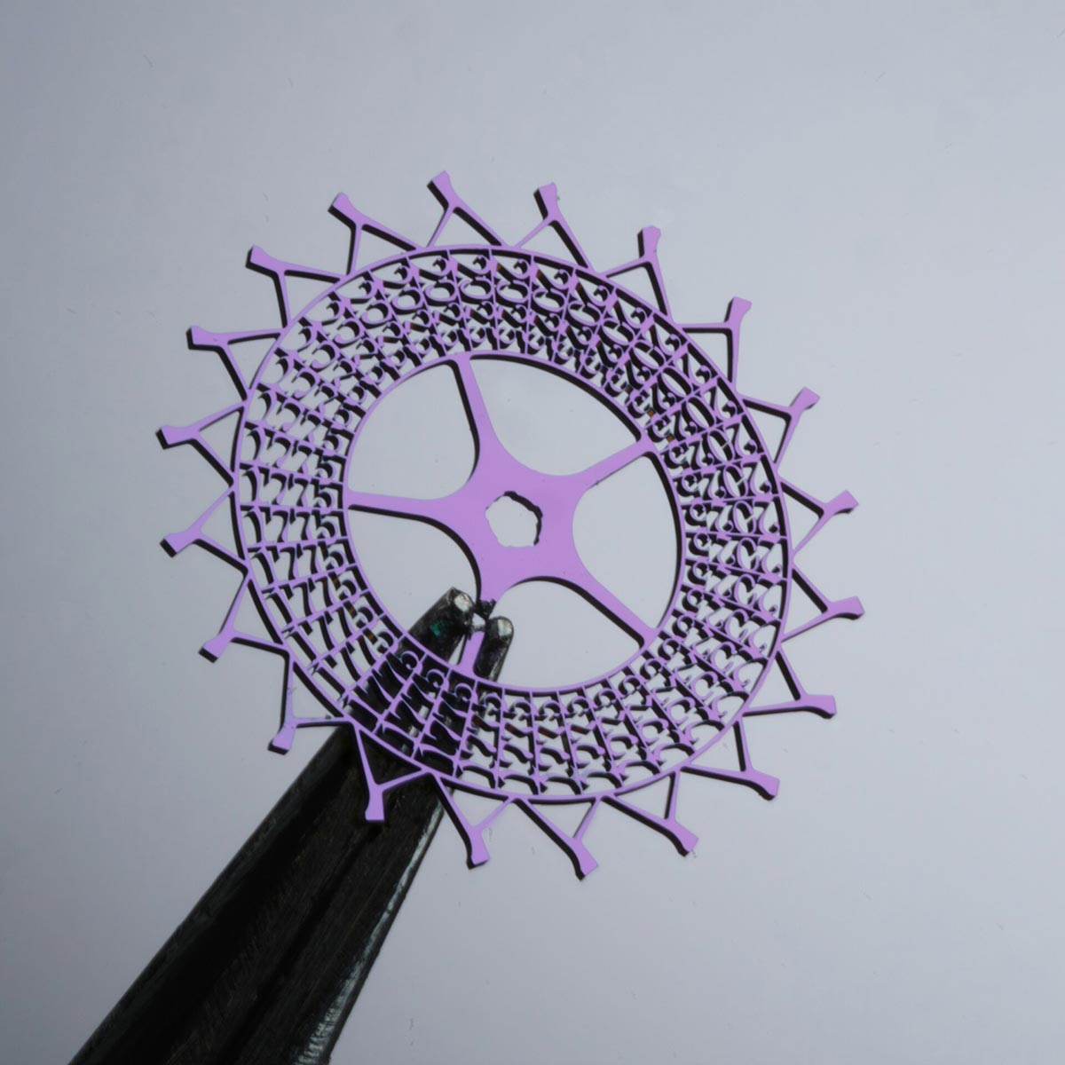 The double silicon balance springs, mounted in opposing alignment, cancel out any asymmetry in their breathing. The silicon lever retains conventional ruby pallets for durability, and the escape wheel, also silicon, is etched so that its spokes form numerals. As it spins, these create a phenakistoscope animation that alternates between “1775” and “2025” twenty frames per second: a fun, discreet, exclusive, and elegant nod to the brand’s anniversary.