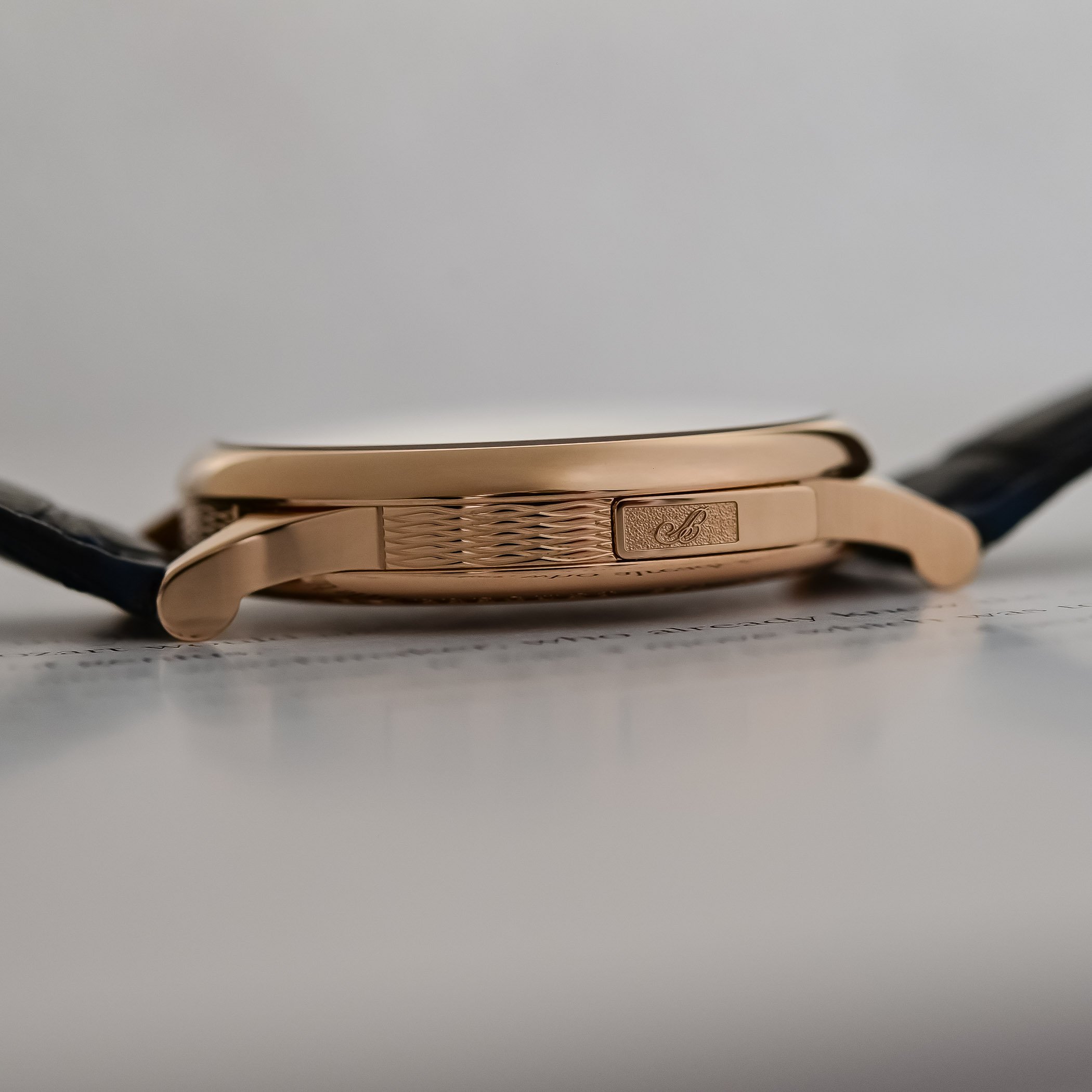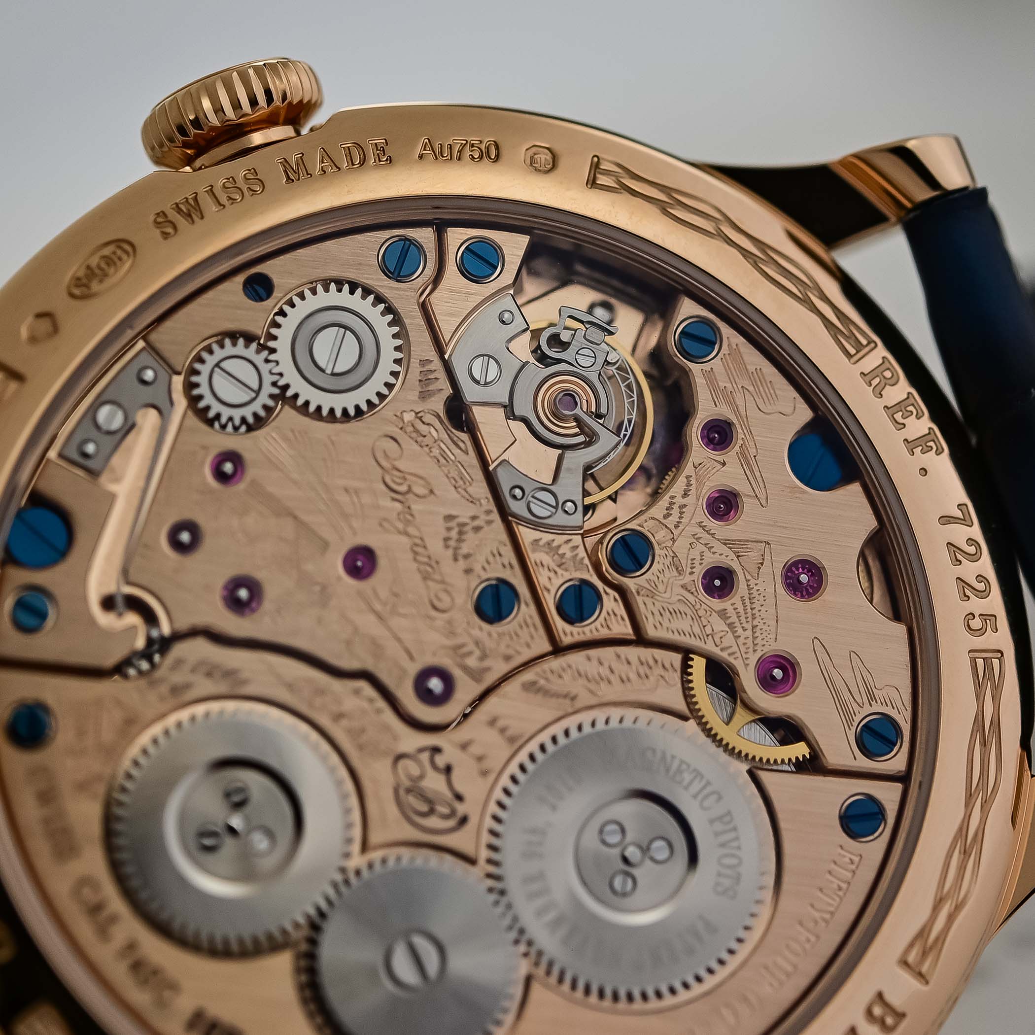 The thickness is a restrained 10.7mm. On the wrist, the watch feels broad but composed, keeping a distinctly elegant profile. The revised lug geometry allows the case to hug the wrist comfortably despite its 41 mm diameter. On a medium wrist, it sits flat, balanced, and distinctly elegant. The 18k Breguet gold (an alloy of gold, copper, silver, and palladium) used for the case has a tone that’s a little softer than the usual rose or yellow gold, giving the watch a warm hue that suits its purpose: a chronometer first, and a showpiece second. The 7225 is water-resistant to 30m.