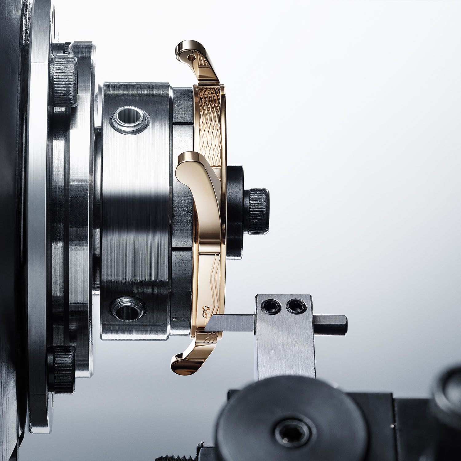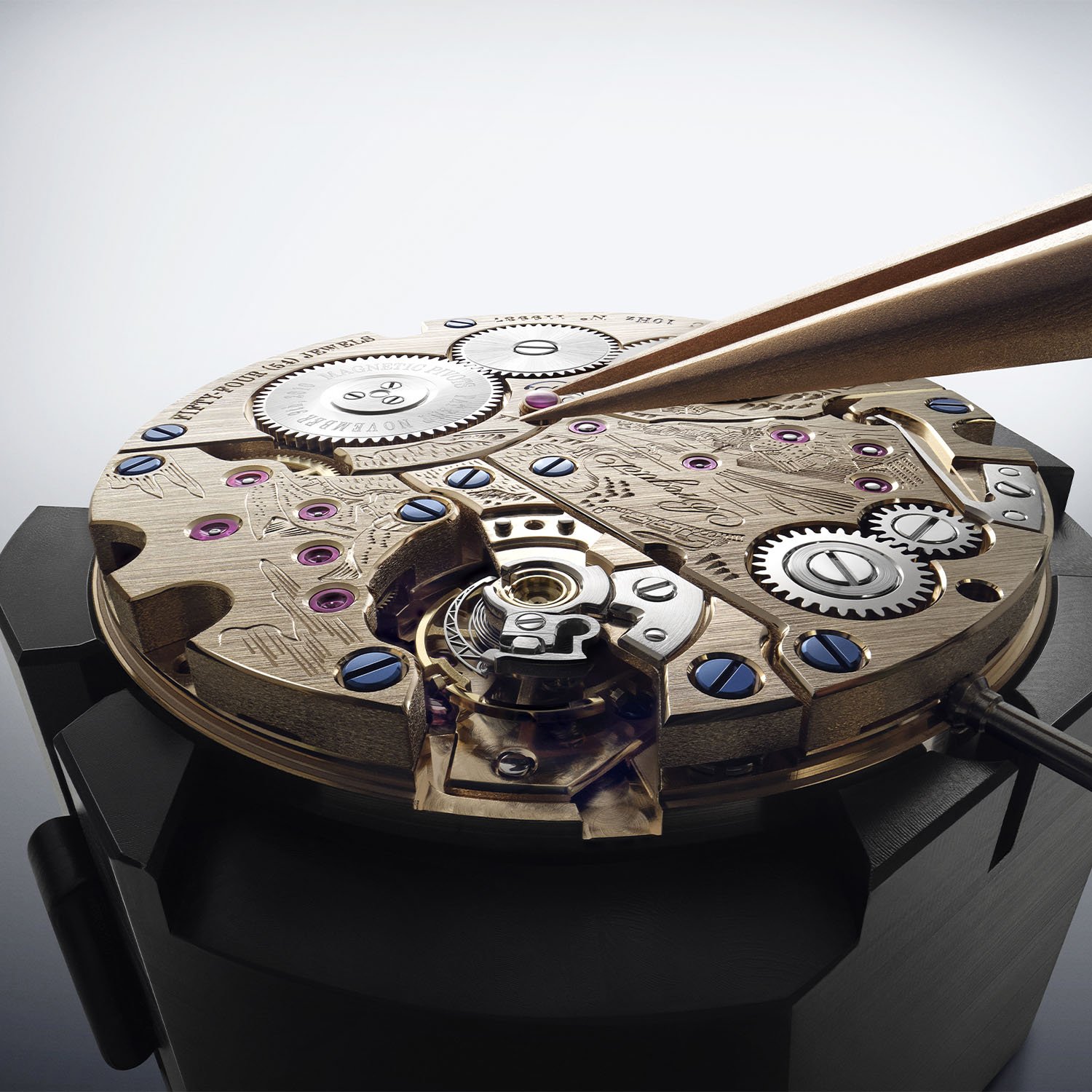 A micro-magnet is placed on either side of the balance-staff and together they create an intense magnetic flux inside the shaft. A subtle, deliberate imbalance in the flux keeps one end of the shaft in constant contact with its endstone. In the event of an impact, the magnetic forces automatically re-centre the shaft. The result is also a balance staff offering unprecedented stability in amplitude. The magnetic pivot also reduces friction drastically, as only the tip of the axis pivots against a jewel, on a minimal surface area. This use of magnetism was made possible thanks to the anti-magnetic properties of silicon, which is used for the double silicon balance-spring, silicon pallet-lever and escape-wheel.