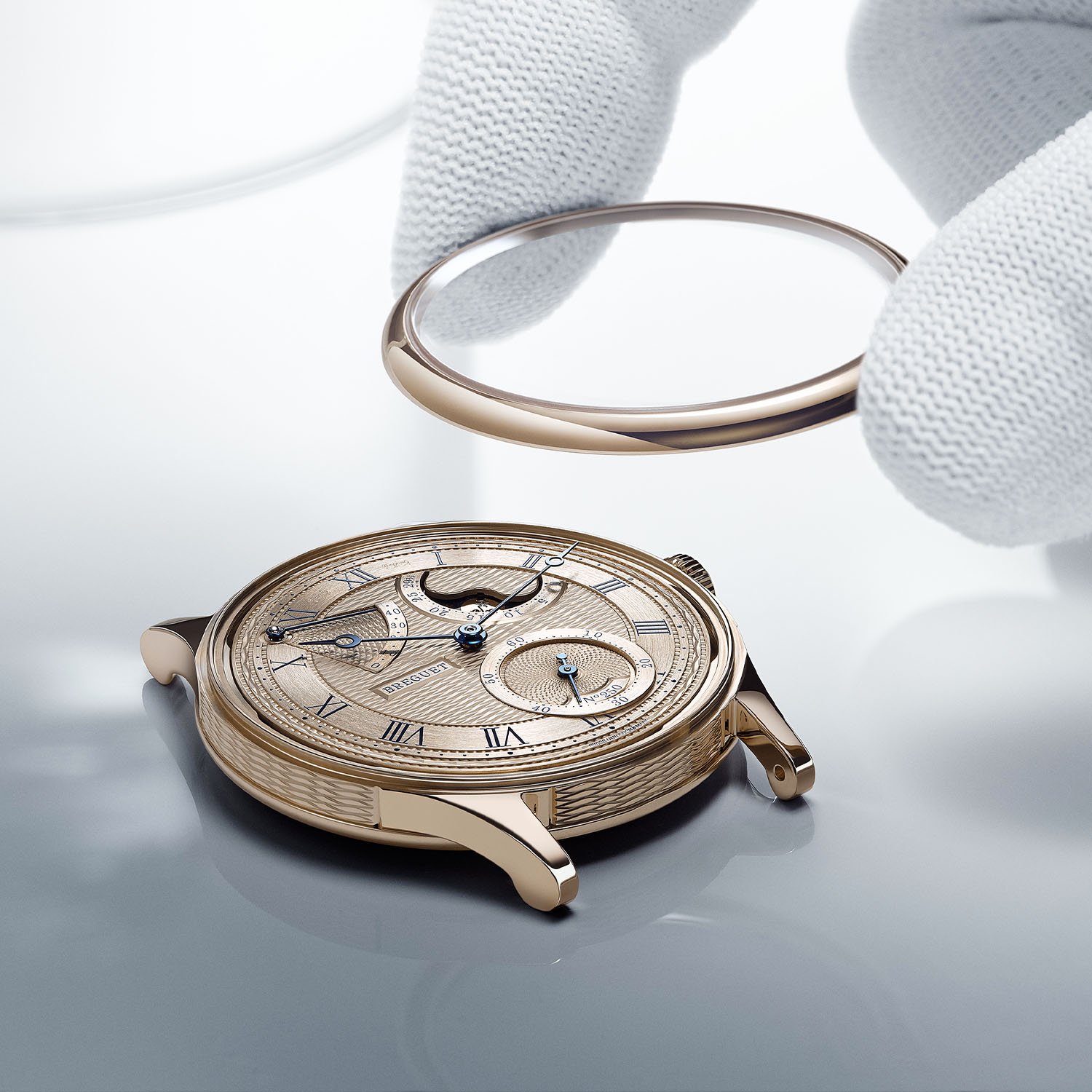 The dial, also made of solid Breguet gold, is peak Breguet style. The entire face of the watch is made using hand-applied guilloché techniques, with the new “Quai de l’Horloge” motif. However, the 7235 isn’t a mere copy of the Classique 7137 and features different indications. The central blued steel Breguet hands indicate the hours and minutes, the power reserve is located at 10:30, the moon phase is at 1:30, and the lower part of the dial is now home to a small seconds. The small seconds and power reserve sector, as well as the dial rim, feature the same “Quai de l’Horloge” pattern, but in a circular rendering. They are separated from the straight guilloché by satin-brushed inserts with blue Roman numerals. The moon at 2 o’clock is an exact reproduction of the one featured on the N°5 watch, just like the rest of the display. Another interesting feature, the dial isn’t flat, but is thinner at the edges than in the centre, giving it a slightly sloping profile at the edge of the chapter ring.