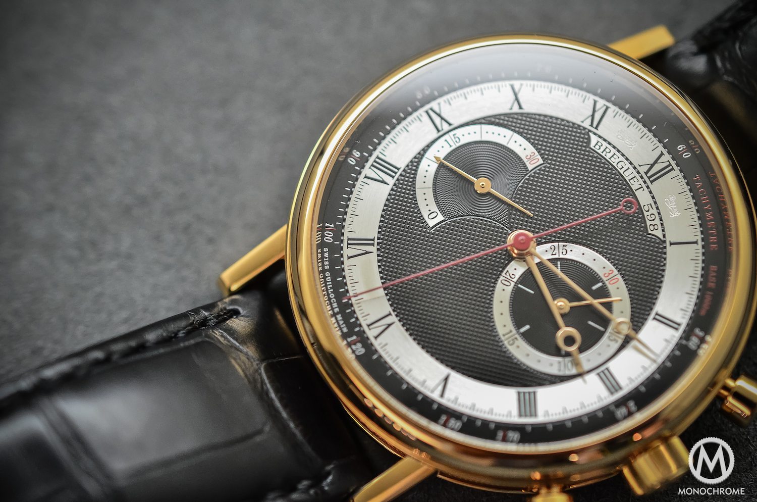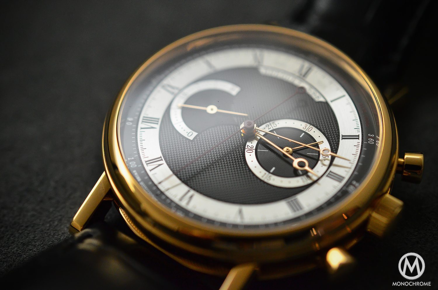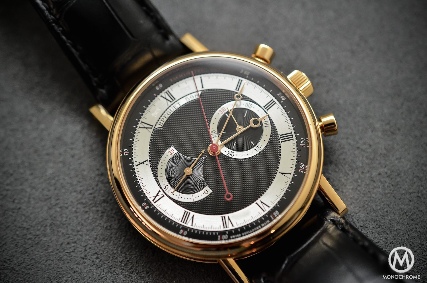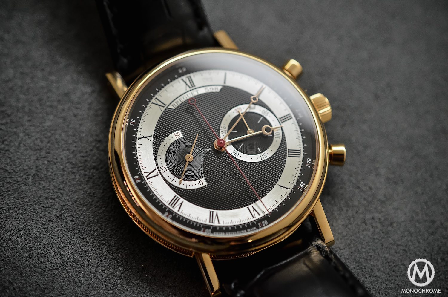 Most of the Breguet (except the Type XX, a range totally apart in the Breguet Collection) are coming with silver dials. This one comes with a guillaché dial, that is classically made of a gold plate, but here coated in black. And that creates a crucial difference, a completely new atmosphere, mixing modernity and traditions. The dial presents 4 patterns: a classical ‘clou de Paris’ in the middle, concentric circles for the counter at 3, circular barleycorn for the counter at 9 and a brushed metallic finish for the sub-counter’s rings and hour-track. Al together it creates a very contrasting and easy-to-read face for a classical chronograph, even more when you consider the manifold finishes.