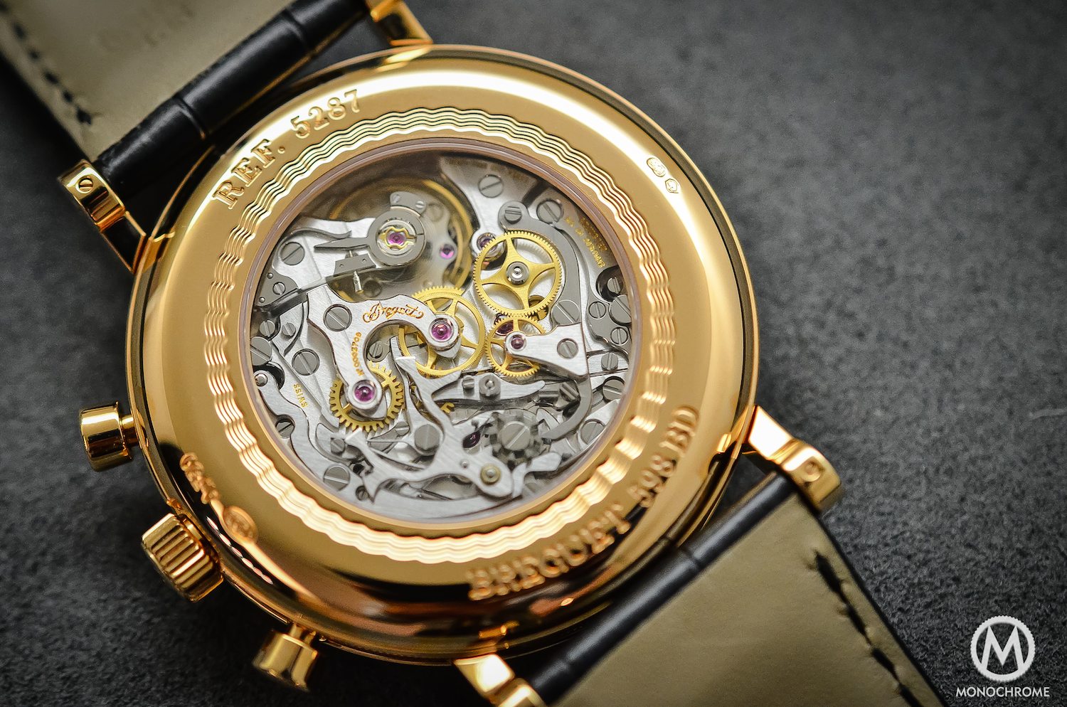 The other typically-Breguet elements are here, with the secret signature that can be found between 12 and 1, the specific hands with the hollowed eccentric moon. The Breguet numerals are not part of the Breguet Classique Chronograph 5287, as they are usually applied on enamel dials. Instead, you’ll find here Roman Numerals. Concerning the case, it comes with the straight soldered lugs with a screwed bar. These are directly welded on the caseband. Talking about the case, the sides are naturally coming with the fluted finish (fine grooves enhanced with double beading) that makes a Breguet so unique. The case itself measures 42.5mm, quite a large diameter for a dress watch and a huge increase compared to its predecessor, the Breguet Classique Chronograph 5247 (with a 39mm diameter). Considering the shape of the lugs and the size of the case, this Breguet Classique Chronograph 5287 will require a solid wrist to feel comfortable.