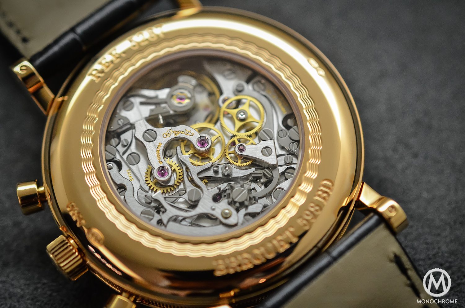 Inside the Breguet Classique Chronograph 5287 ticks the Calibre 533.3 that was also used in the Breguet Chronograph 5247. It is a column-wheel chronograph movement based on the Lemania CH 27 that finds its roots in the 1940s (don’t forget that Lemania is now owned by the Swatch Group, also owner of Breguet). It is however seriously reworked by Breguet that adds its own finish – Geneva stripes, anglagle, polished screw heads and slots, complete finishing of the chronograph’s gears and levers. it is clean and dry pleasant to admire it through the sapphire caseback. It boasts 48 hours of power reserve, has 24 jewels, ticks at 3Hz, is adjusted in 6 positions and comes with (obviously) a Breguet balance spring. This movement may not be the more modern of the industry but it remains one of the most beautiful ever made.