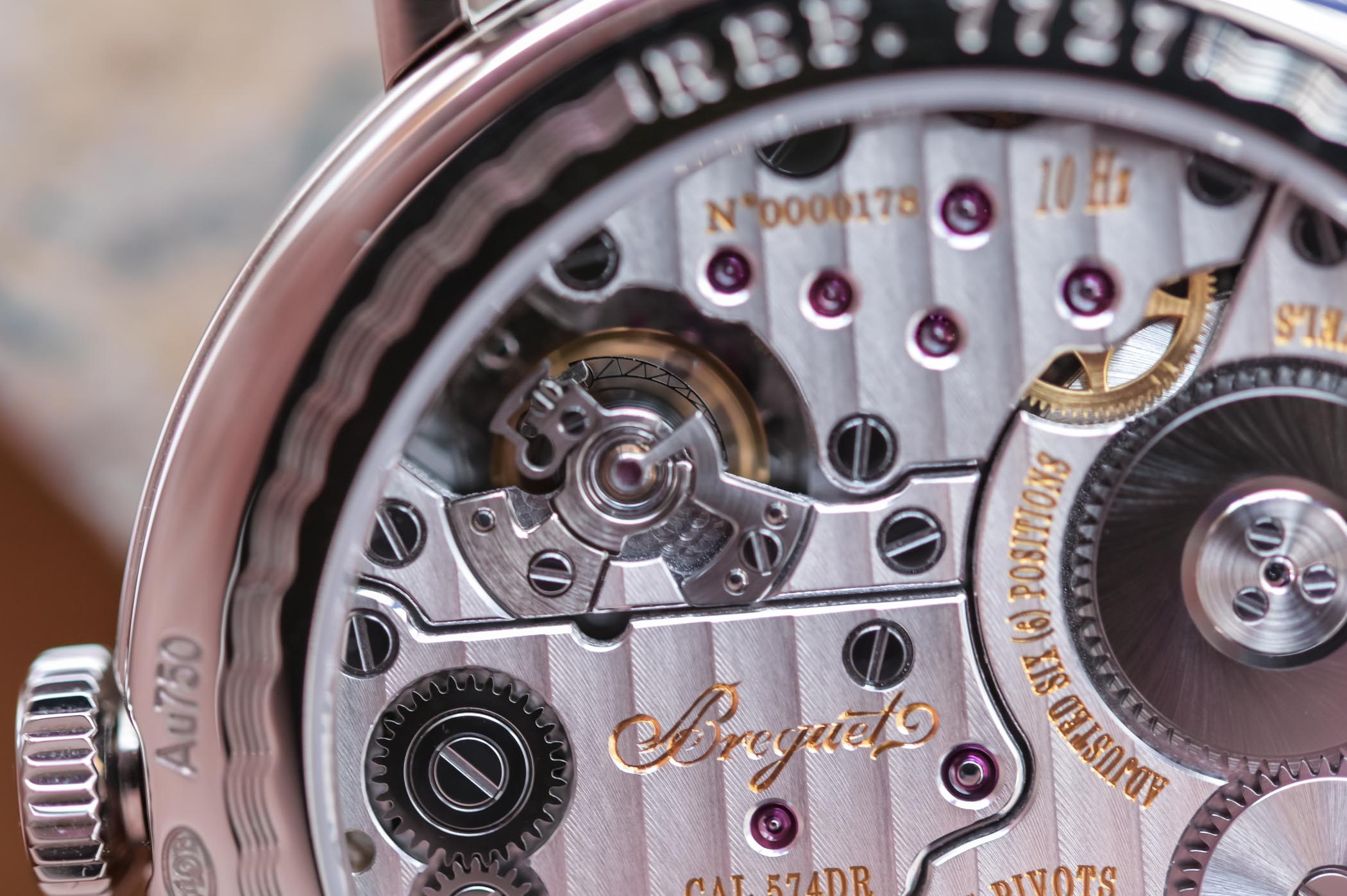 So what hides behind this refined hand-guilloché dial with no fewer than six patterns? What’s the real deal with the 7727? Part of the answer is printed on the dial: the 10Hz frequency. But that’s just the tip of the iceberg. There’s more than just a (very) high frequency inside this watch. There’s the way to achieve it. As indicated by its name, this watch is an ode to the fine art of chronométrie, a focus on accuracy and precision. While most watches have a 4Hz frequency – known as the best compromise between stress and accuracy – and some watches run at a 5Hz frequency, which causes more stress on the parts, the Breguet features a 10Hz regulating organ beating at 72,000 vibrations per hour. It is known that the faster the balance and escapement beat, the better the accuracy. In essence, it has a better capacity to compensate for its own errors. But reliability and extreme frequency are almost incompatible.
