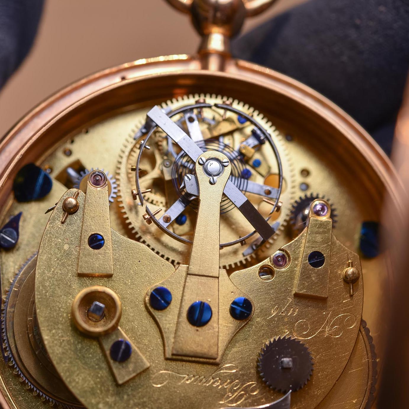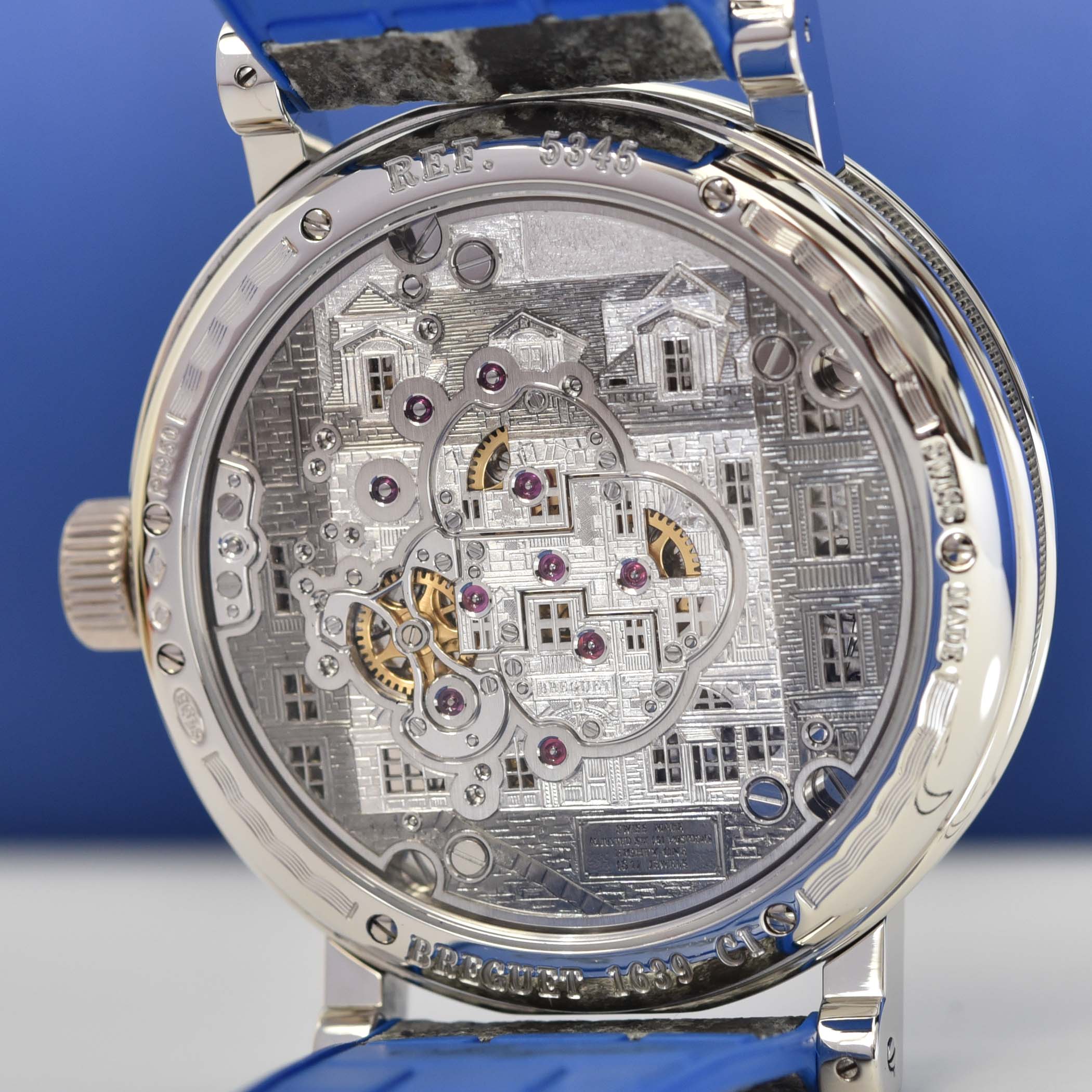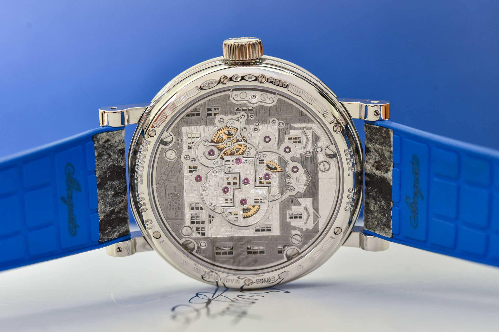 The back of the watch is as effusive as the dial. Composed of four bridges in solid gold, the movement’s back is entirely hand-engraved with the façade of A.L. Breguet’s house at 39 Quai de l’Horloge, Paris. This engraving is then coated in two different tones of grey to reveal the detail, but there are also windows revealing the gold-coloured wheels and the jewels.