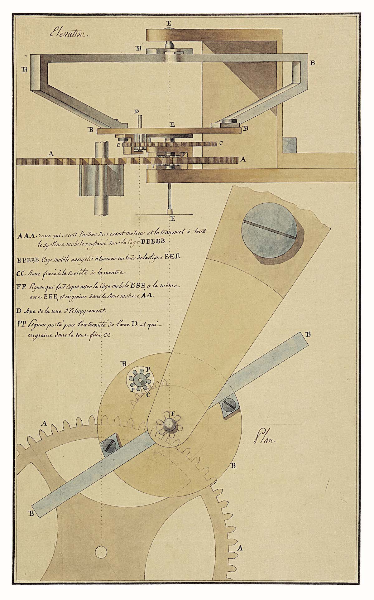 The tourbillon is a complex device invented and patented by Abraham-Louis Breguet on 26 June 1801, or rather on 7 Messidor, year IX (according to the French revolutionary calendar). This device, which consisted of placing the regulating organ (balance, hairspring, lever and escape-wheel) in a rotating cage making a complete revolution on itself (usually once per minute), was created to solve the issue of gravity and its effects on the regularity of horological movements, in that it provokes variations in timing adjustment with each change of position of a watch when worn. Thanks to this mobile carriage all the flaws resulting from gravity are regularly repeated and consequently engaged in a process of mutual compensation.