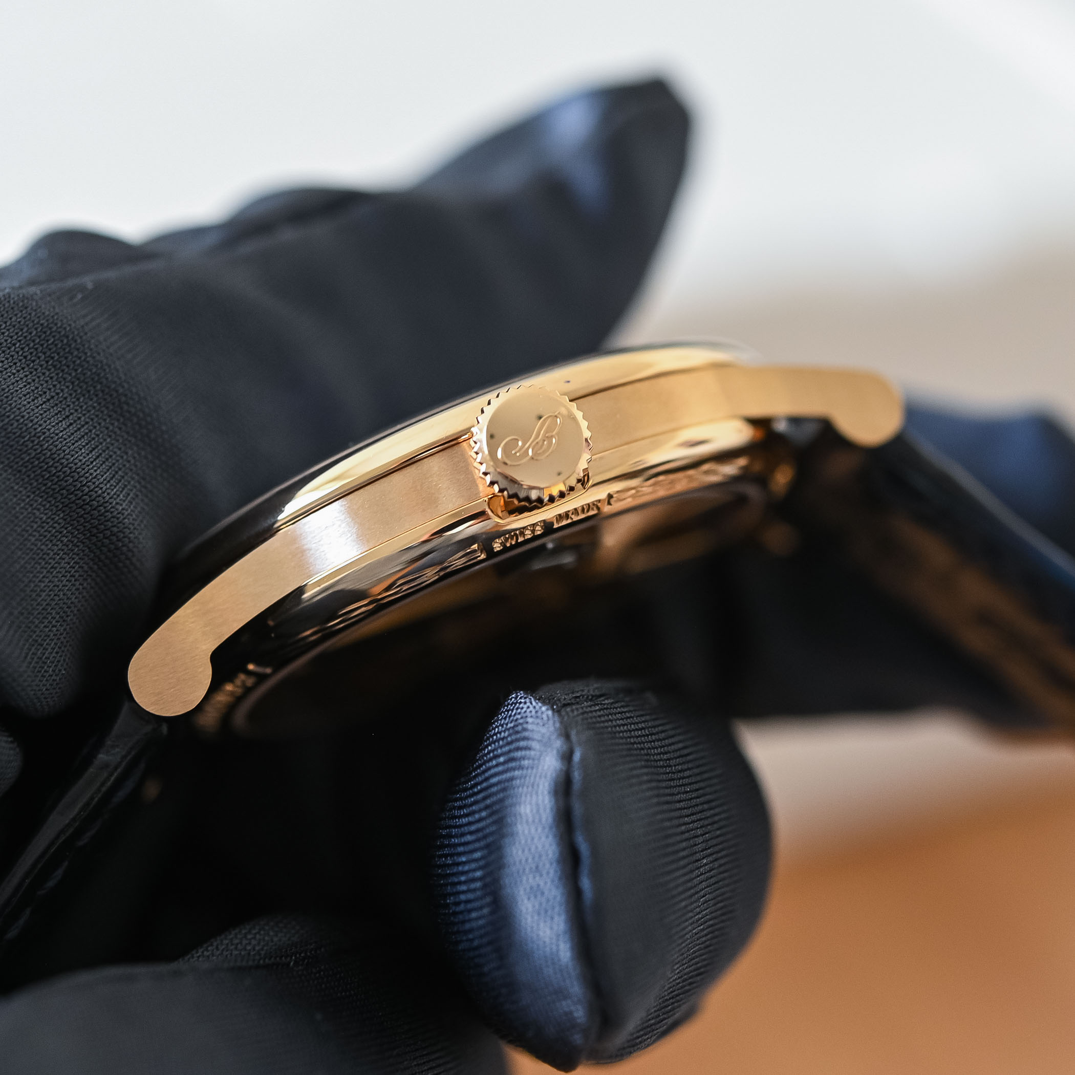 Instead, the case of the Classique Souscription has a more traditional 3-part construction with lugs integrated within the middle case, the latter being satin-brushed on the flanks, with lug tips that end with an almost teardrop shape (there’s a bit of Laurent Ferrier in this smooth style). These, however, offer better ergonomics than the traditional straight lugs, and a better fit on the wrist. A polished domed bezel frames a sapphire crystal with a “chevé” profile – a reference to another innovative style of Breguet, with a crystal that was thinner and less domed than others, with a relatively flat surface and a bevel on the edge. The back brings classic guilloché around the see-through caseback.