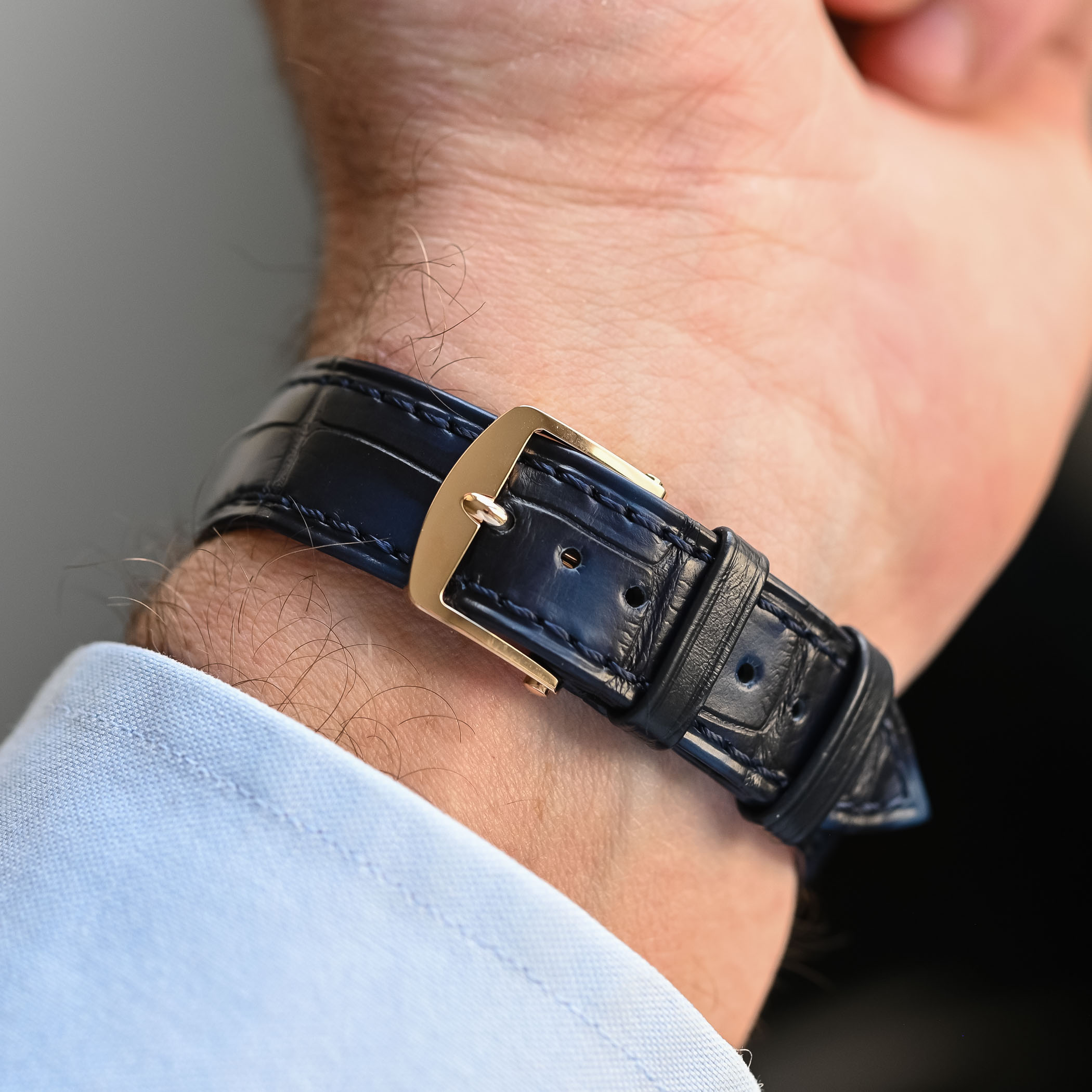 The Breguet Classique Souscription 2025 is worn on a navy blue large-scaled alligator leather, with a discreet gradient effect, and closed by an 18k Breguet gold pin buckle. It is delivered in a new presentation box that pays tribute to the red Moroccan leather cases once used by A.-L. Breguet, with the individual serial number and logo on top.