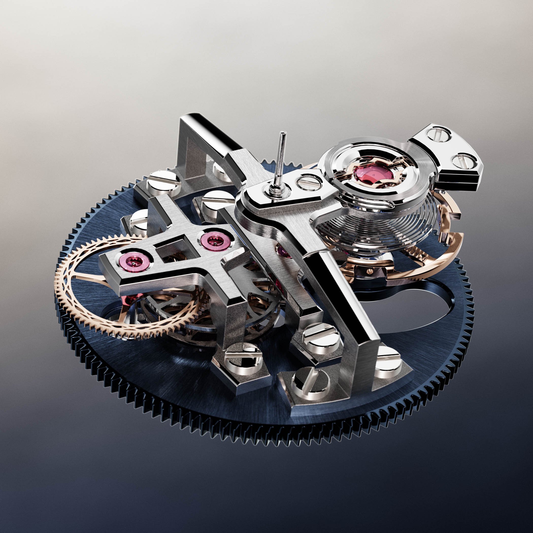 The construction of the escapement mechanism is also unusual. Between its two escape wheels equipped with a magnetic track, an intermediate stop wheel ensures that the device does not suffer any unwanted jumps. Most of the other tourbillon components are non-magnetic in order to avoid any interaction that could interfere with its smooth running. The balance-spring is made of silicon, the fixed fourth wheel of LIGA (NiP12) and the other components of titanium or Nivagauss.