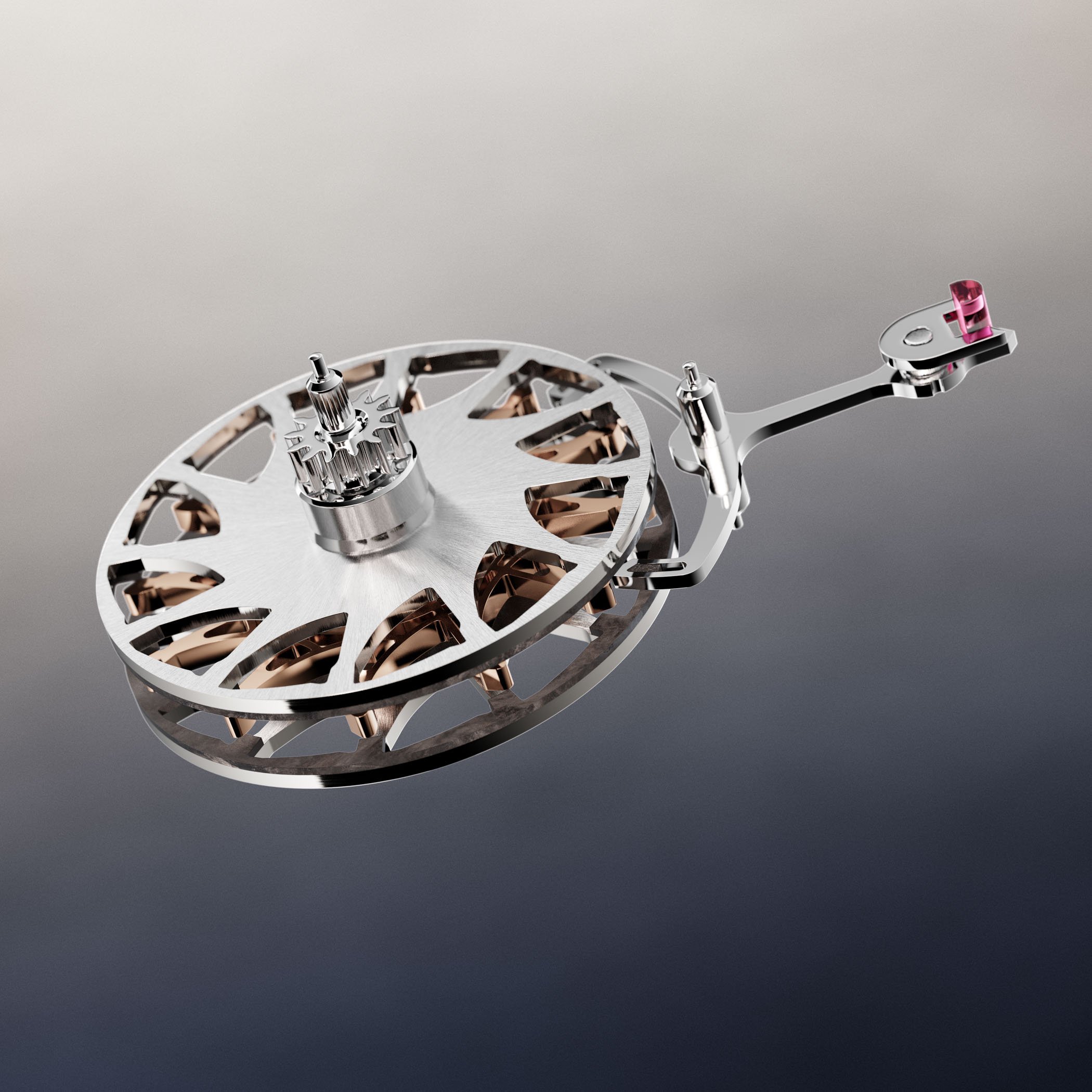 This newly developed device involves two escape wheels, each equipped with a magnetic track, at the centre of which beats a pallet lever with likewise magnetic pallets. The idea is to take cues from constant-force escapements. Below a certain operating torque, the tourbillon stops very quickly, while above this threshold, the balance oscillates at its maximum amplitude. This new escapement also makes it possible to decouple the impulses transmitted to the balance from the rotation of the escape wheel and hence from the rest of the gear train. Unlike in a Swiss lever movement, the inertia of the tourbillon cage has almost no influence. By decoupling these two functions, Breguet has been able to create a tourbillon with a 10Hz oscillator in such dimensions, also giving free rein to design choices, for example by offsetting its balance from the cage’s centre of rotation.
