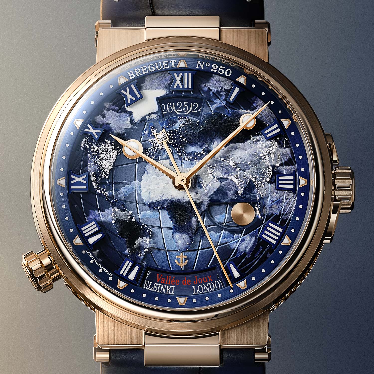 The gold base dial, decorated with a horizontal gradient transitioning from sky blue at the centre to navy blue on the periphery, is embellished with handmade guilloché meridians and parallels, creating the optical illusion of a curved Earth. The viewpoint is inspired by NASA’s “Black Marble” nocturnal view of Earth.