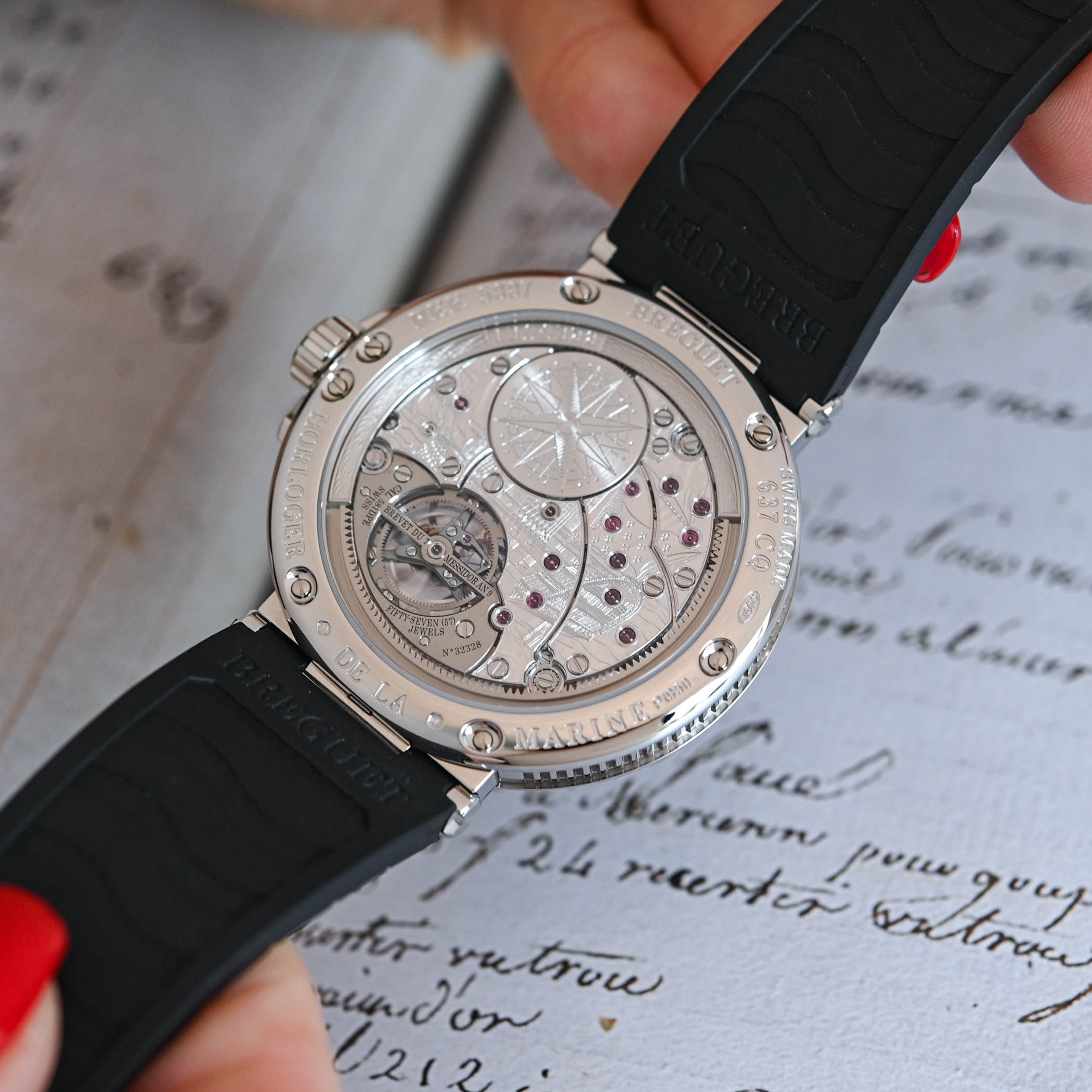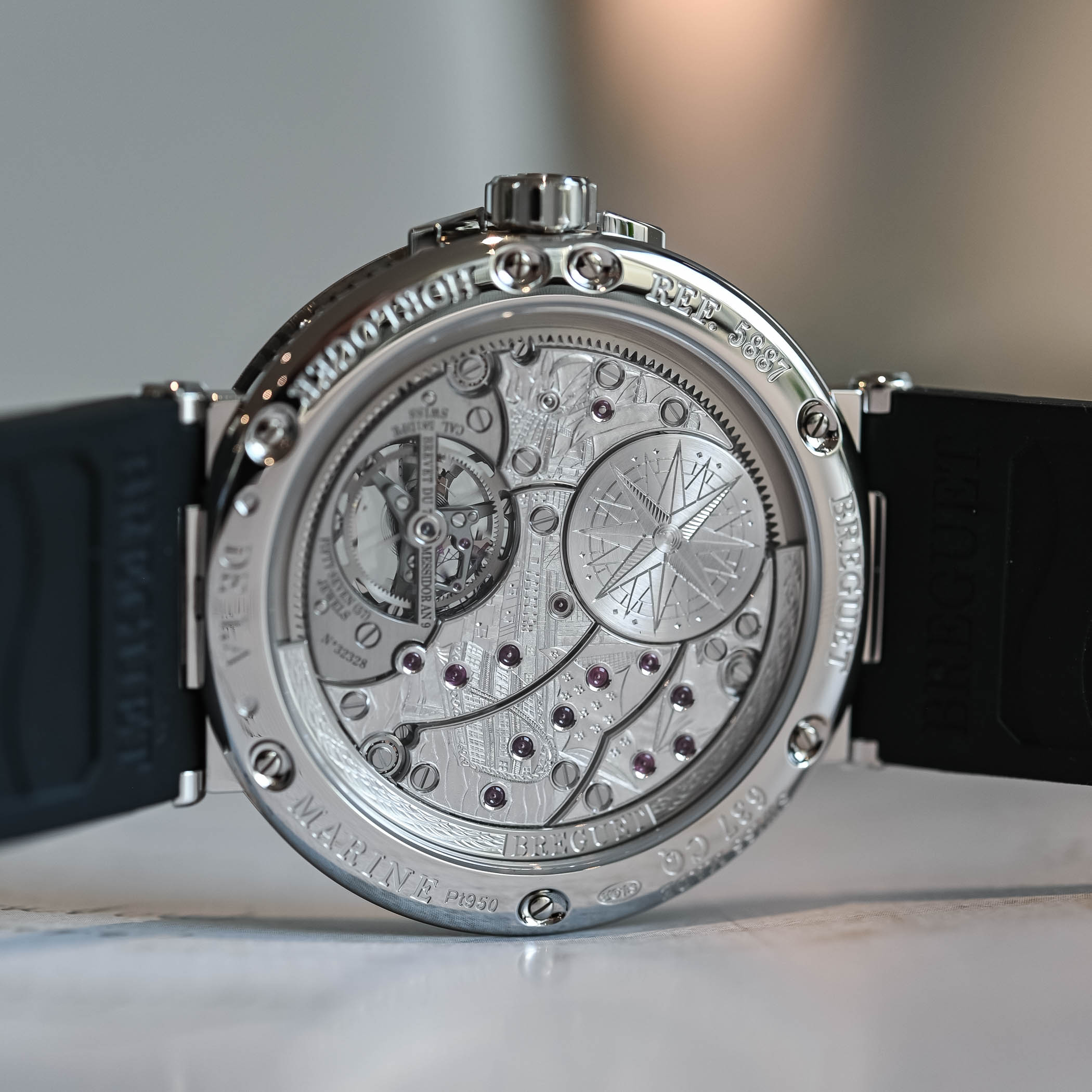 The Marine Equation Marchante 5887 has to be seen as the technical flagship of the brand’s nautical-inspired collection. While retaining the rather bold and striking look found in other members of this family, which includes time-and-date models, an alarm watch, a chronograph, a classic tourbillon and the Hora Mundi traveller’s model, it adds a fair dosage of complications. Besides an ultra-thin base movement with peripheral rotor and tourbillon regulator, it also includes a QP with retrograde date and an Equation Marchante, which records the difference between local time – the time that punctuates our daily lives – and solar time – the time dictated by the earth’s rotation relative to the sun. And like the rest of the collection, it pays tribute to the prestigious title “Watchmaker to the French Royal Navy” awarded to Abraham-Louis Breguet by Louis XVIII on October 27th, 1815, a year after he was appointed a member of the Board of Longitude.