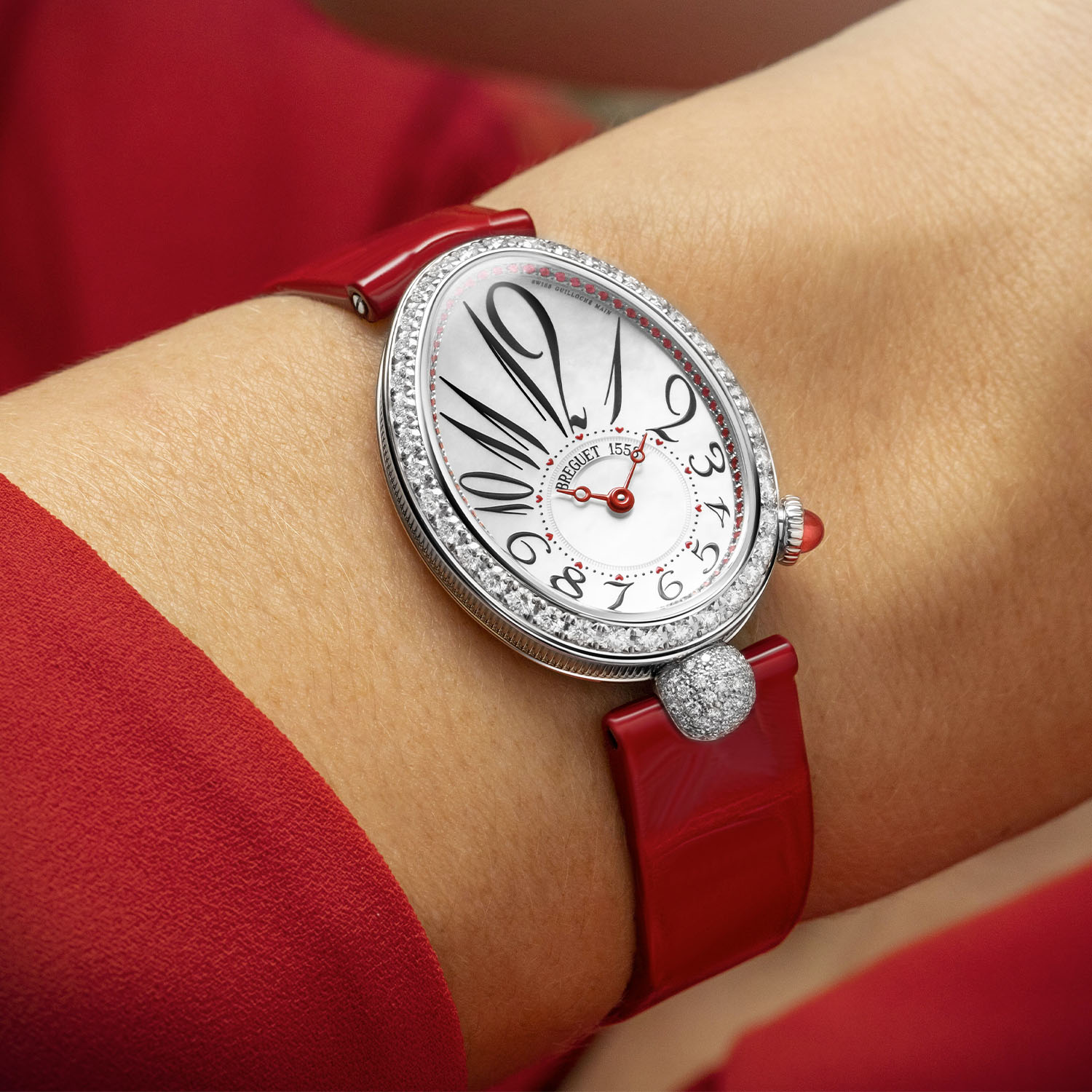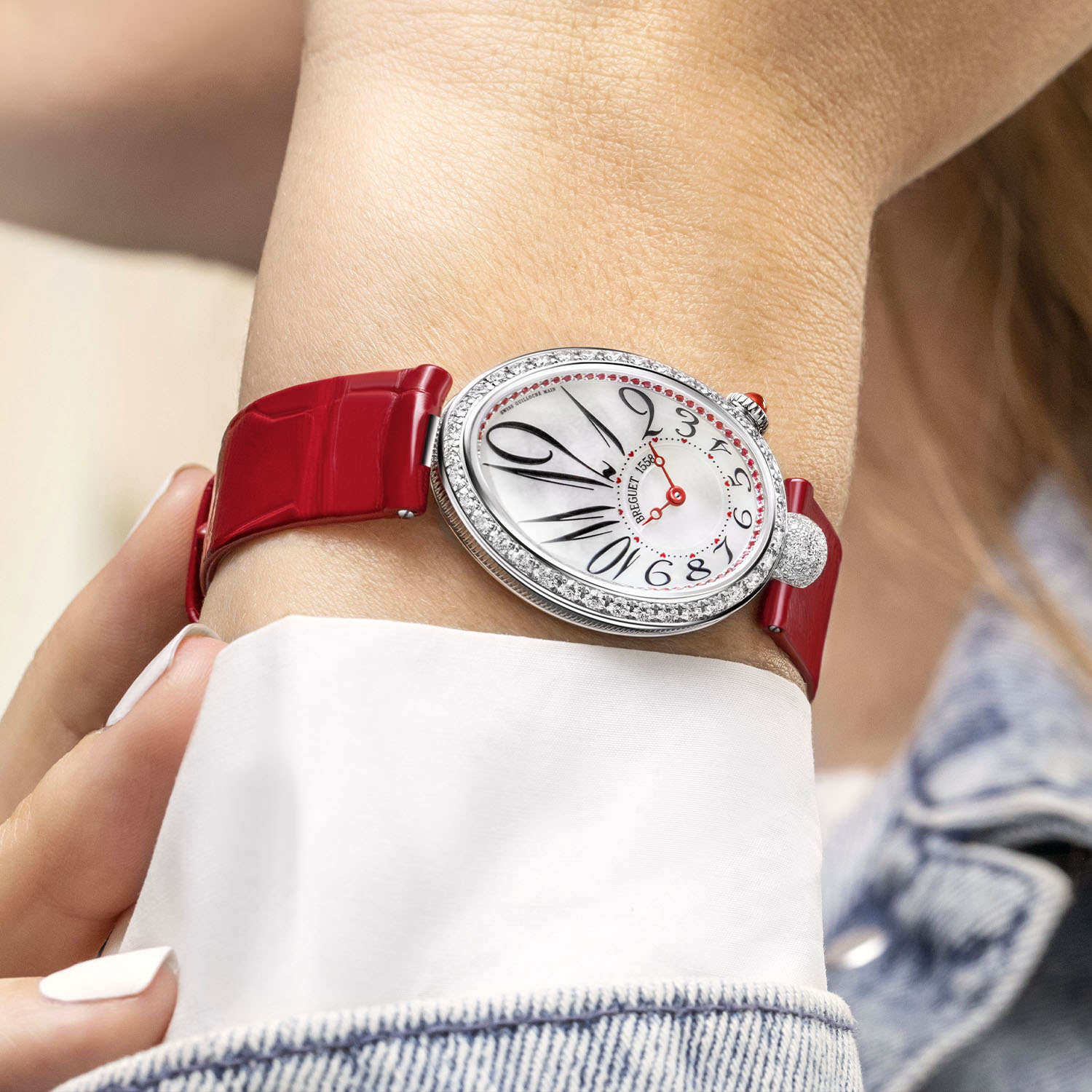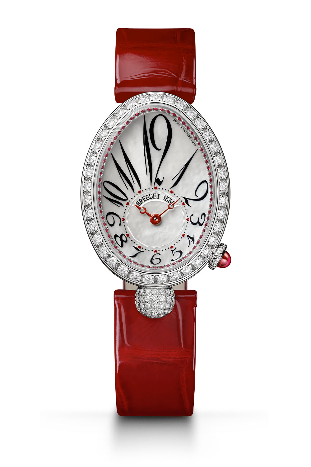 Unlike Caroline Murat’s wristwatch, attached by a bracelet made of hair and intertwined gold threads, women will be pleased to note that the Reine de Naples 8925 comes on a bright, glossy red alligator leather strap with a buckle set with 28 diamonds.