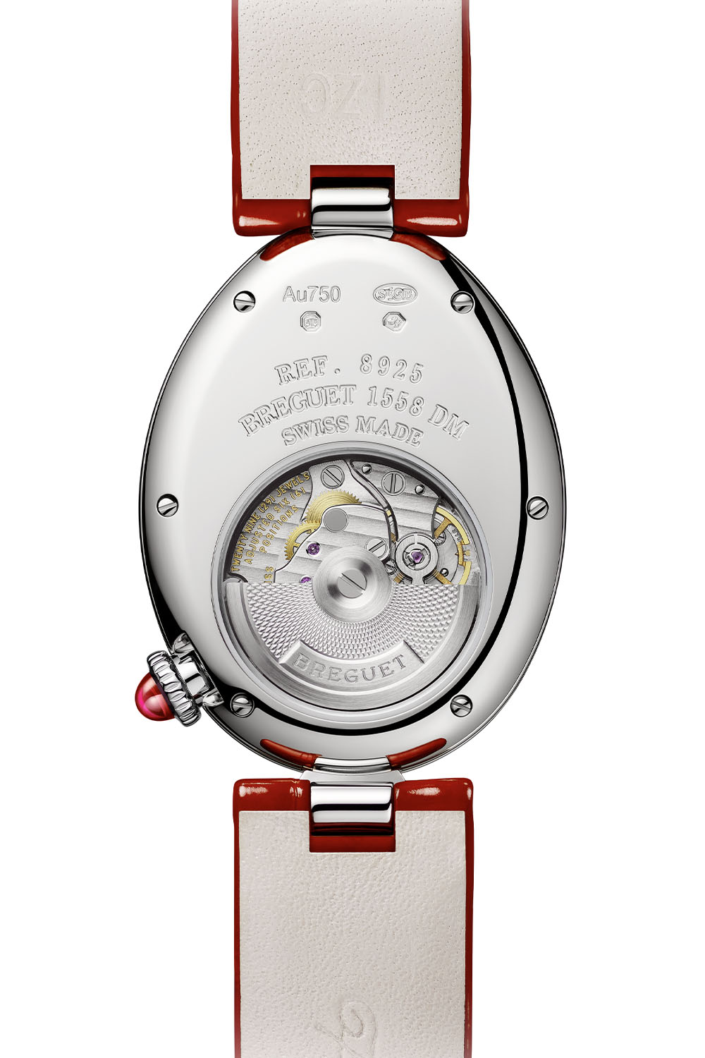 The egg-shaped 18k white gold case has petite feminine dimensions with a diameter of 24.95mm, a length of 33mm and a slim height of 8.5mm. The fine fluting on the caseband is a distinctive feature of Breguet’s watches and follows the contours of the oval shape that is wider at the bottom and narrower at the top. The crown, placed at 4 o’clock – so as not to interfere with the oval case shape – is set with a bright red cabochon-cut ruby, while the distinctive round-shaped attachment covering the strap at 6 o’clock is set with diamonds. Underscoring the tapering egg-shaped case, the 45 hand-set diamonds in the bezel follow the contours beautifully.